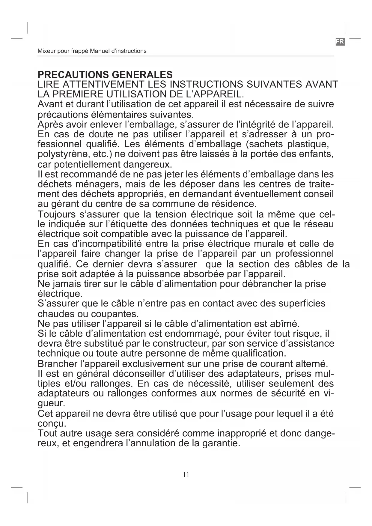 Si le cable d'alimentation est endommagé, pour éviter tout risque, il devra être substitué par le constructeur, par son service d'assistance technique ou toute autre personne de même qualification.