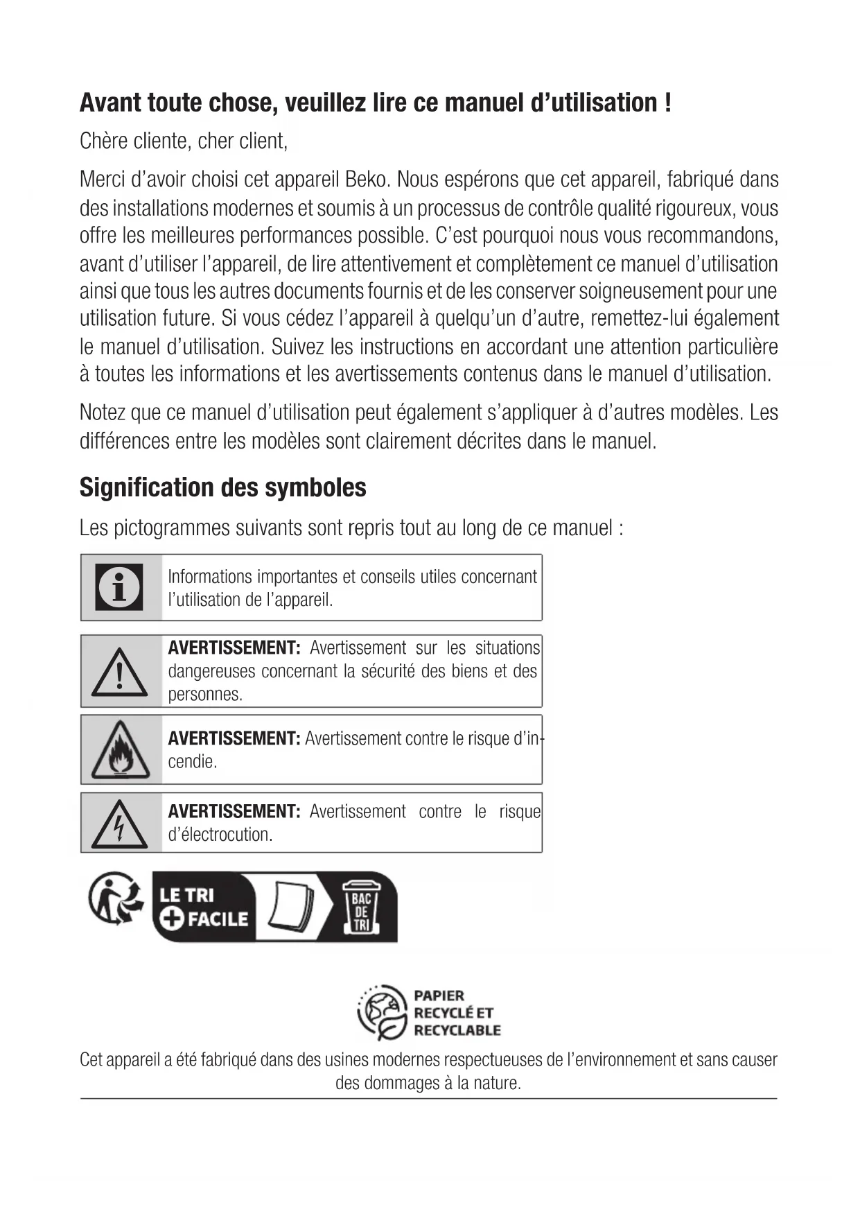 - Les produits Beko sont conformes aux normes de sécu- rité applicables. Par conséquent, en cas de dommage sur l’appa- reil ou son câble d’alimentation, le faire réparer ou remplacer par le revendeur, le centre SAV, un spécialiste ou des services habi- lités afin de prévenir tout danger. Des réparations défectueuses et non professionnelles peuvent être sources de danger et de risque pour l’utilisateur.