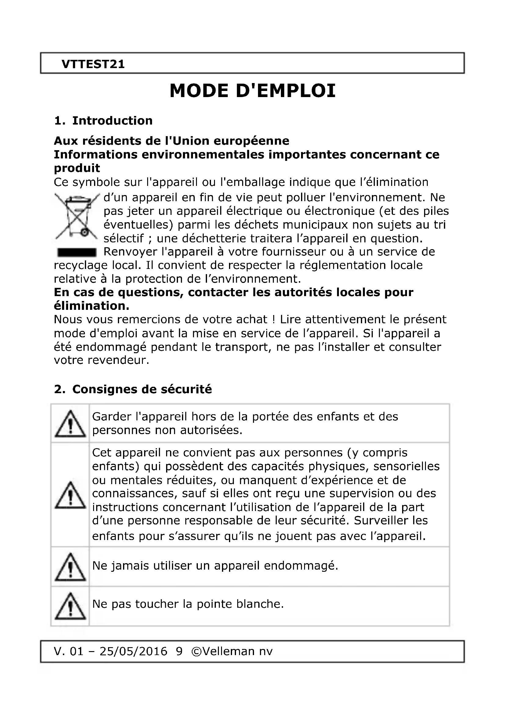 SA Velleman est l’ayant droit des droits d’auteur de ce mode d'emploi. Tous droits mondiaux réservés. Toute reproduction, traduction, copie ou diffusion, intégrale ou partielle, du contenu de ce mode d'emploi par quelque procédé ou sur tout support électronique que ce soit est interdite sans l’accord préalable écrit de l’ayant droit.VTTEST21