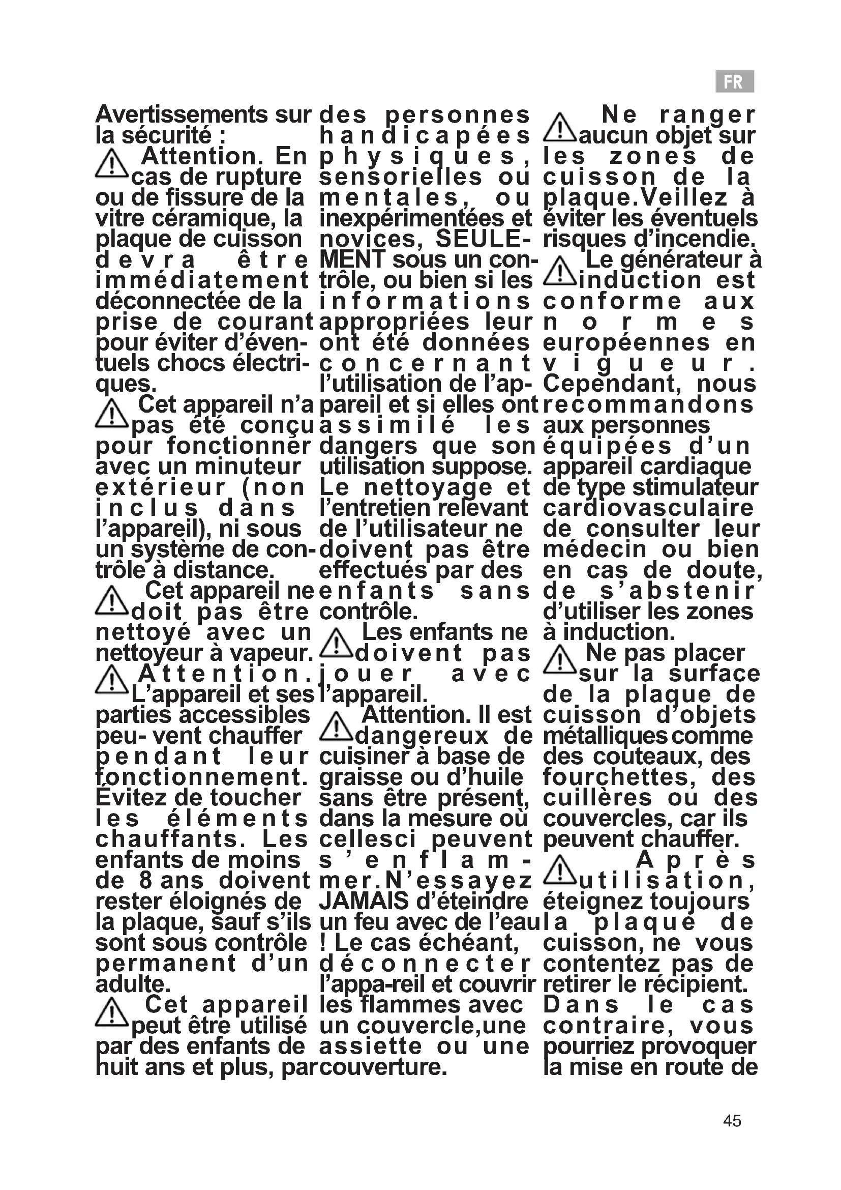 Avertissements sur la sécurité : Attention. En cas de rupture ou de ssure de la vitre céramique, la plaque de cuisson devra être immédiatement déconnectée de la prise de courant pour éviter d’éven- tuels chocs électri- ques. Cet appareil n’a pas été conçu pour fonctionner avec un minuteur extérieur (non inclus dans l’appareil), ni sous un système de con- trôle à distance. Cet appareil ne doit pas être nettoyé avec un nettoyeur à vapeur. A t t e n t i o n . L’appareil et ses parties accessibles peu- vent chauer pendant leur fonctionnement. Évitez de toucher les éléments chauffants. Les enfants de moins de 8 ans doivent rester éloignés de la plaque, sauf s’ils sont sous contrôle permanent d’un adulte. Cet appareil peut être utilisé par des enfants de huit ans et plus, par des personnes handicapées physiques, sensorielles ou mentales, ou inexpérimentées et novices, SEULE- MENT sous un con- trôle, ou bien si les informations appropriées leur ont été données concernant l’utilisation de l’ap- pareil et si elles ont assimilé les dangers que son utilisation suppose. Le nettoyage et l’entretien relevant de l’utilisateur ne doivent pas être effectués par des enfants sans contrôle. Les enfants ne doivent pas jouer avec l’appareil. Attention. Il est dangereux de cuisiner à base de graisse ou d’huile sans être présent, dans la mesure où cellesci peuvent s’enflam- mer.N’essayez JAMAIS d’éteindre un feu avec de l’eau ! Le cas échéant, déconnecter l’appa-reil et couvrir les flammes avec un couvercle,une assiette ou une couverture. Ne ranger aucun objet sur les zones de cuisson de la plaque.Veillez à éviter les éventuels risques d’incendie. Le générateur à induction est conforme aux normes européennes en vigueur. Cependant, nous recommandons aux personnes équipées d’un appareil cardiaque de type stimulateur cardiovasculaire de consulter leur médecin ou bien en cas de doute, de s’abstenir d’utiliser les zones à induction. Ne pas placer sur la surface de la plaque de cuisson d’objets métalliques comme des couteaux, des fourchettes, des cuillères ou des couvercles, car ils peuvent chauer. Après utilisation, éteignez toujours la plaque de cuisson, ne vous contentez pas de retirer le récipient. Dans le cas contraire, vous pourriez provoquer la mise en route deFR