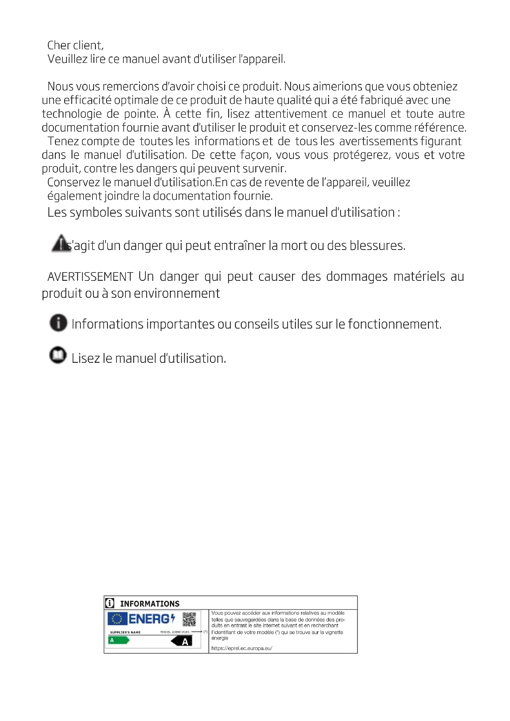 Cher client, Veuillez lire ce manuel avant d'utiliser l'appareil. Nous vous remercions d'avoir choisi ce produit. Nous aimerions que vous obteniez une efficacité optimale de ce produit de haute qualité qui a été fabriqué avec une technologie de pointe. À cette fin, lisez attentivement ce manuel et toute autre documentation fournie avant d'utiliser le produit et conservez-les comme référence. Tenez compte de toutes les informations et de tous les avertissements figurant dans le manuel d'utilisation. De cette façon, vous vous protégerez, vous et votre produit, contre les dangers qui peuvent survenir. Conservez le manuel d'utilisation.En cas de revente de l’appareil, veuillez également joindre la documentation fournie. Les symboles suivants sont utilisés dans le manuel d'utilisation : Il s'agit d'un danger qui peut entraîner la mort ou des blessures. AVERTISSEMENT Un danger qui peut causer des dommages matériels au produit ou à son environnement Informations importantes ou conseils utiles sur le fonctionnement. Lisez le manuel d'utilisation.2 / 36 FR Le réfrigérateur/Le guide d’utilisation 1 Consignes de sécurité 3