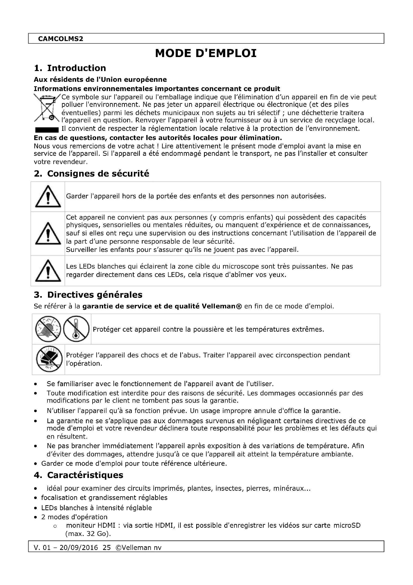 Retrouvez gratuitement la notice de l'appareil CAMCOLMS2 VELLEMAN au format PDF.