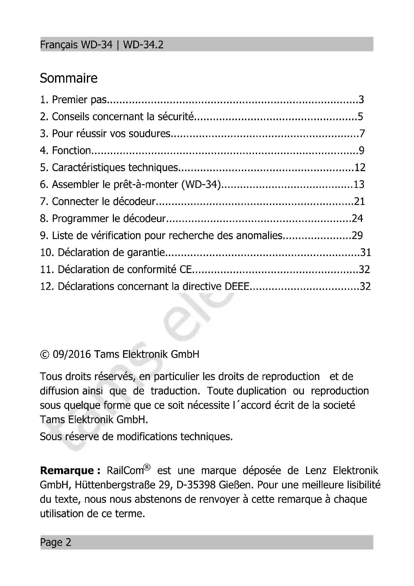 est une marque déposée de Lenz Elektronik GmbH, Hüttenbergstraße 29, D-35398 Gießen. Pour une meilleure lisibilité du texte, nous nous abstenons de renvoyer à cette remarque à chaque utilisation de ce terme. Page 2tams elektronik
