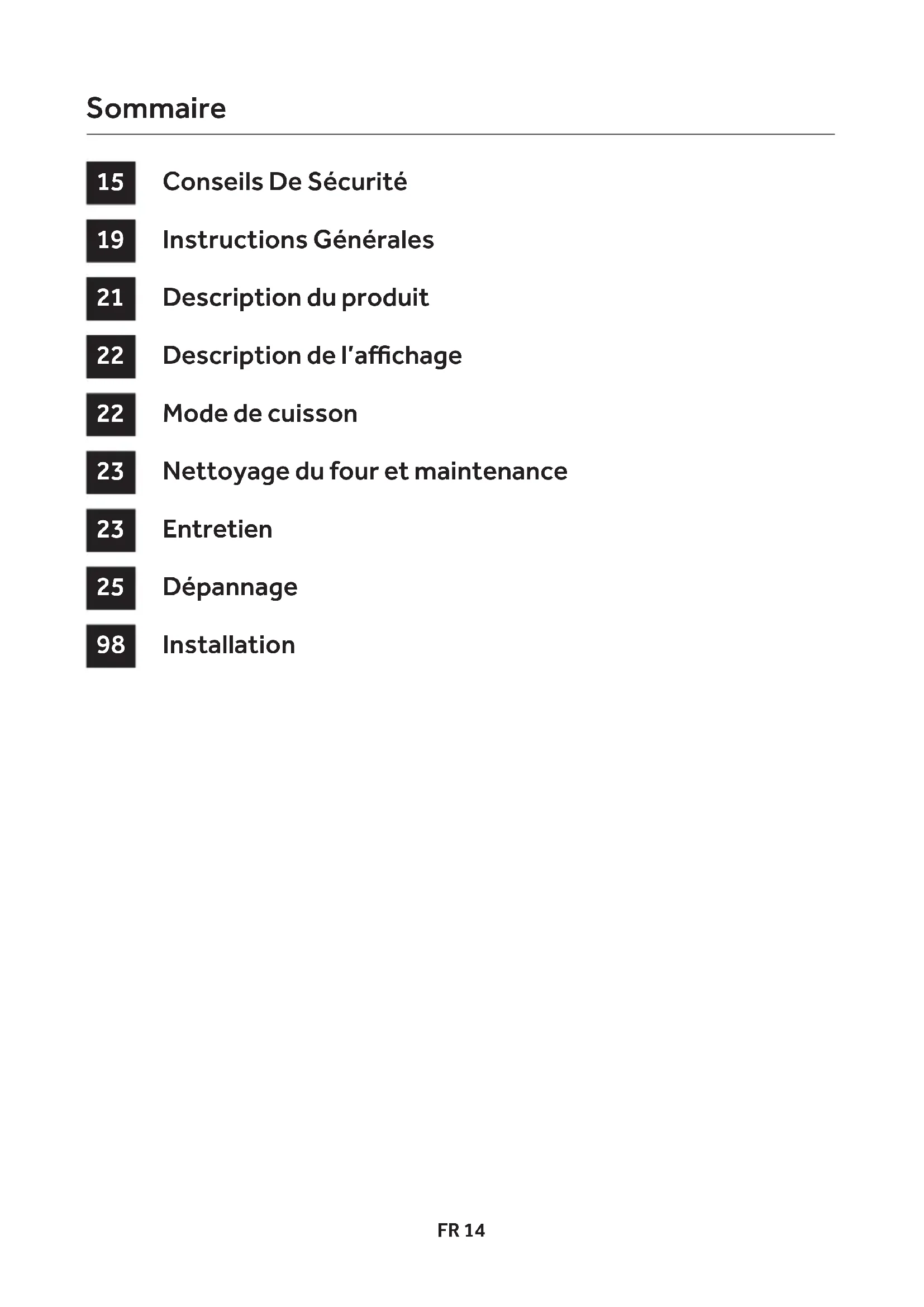 MENT Lorsque cela est possible, éviter le préchauage du four et éviter de le faire tourn- er à vide. N’ouvrez la porte du four que lorsque cela est nécessaire, car il y a des déperditions de chaleur à chaque fois qu’il est ouvert. Pour une économie d’énergie signicative, étein- dre le four entre 5 et 10 minutes avant la n de cuisson prévue, et utiliser la chaleur que le four continue de générer. Gardez les joints propres et en bon état, pour éviter toute déperdition d’énergie. Si vous avez un contrat électrique avec un tarif heure creuse, le programme “cuisson diérée” peut vous faire réaliser des économies d’énergie en déplaçant le début du programme à un intervalle de temps à tarif réduit.IT 26 Indicazioni di Sicurezza Avvertenze Generali Descrizione del Prodotto Descrizione del display Modalità di cottura Pulizia e manutenzione del forno Manutenzione Risoluzione dei Problemi Garanzie Installation Sommario