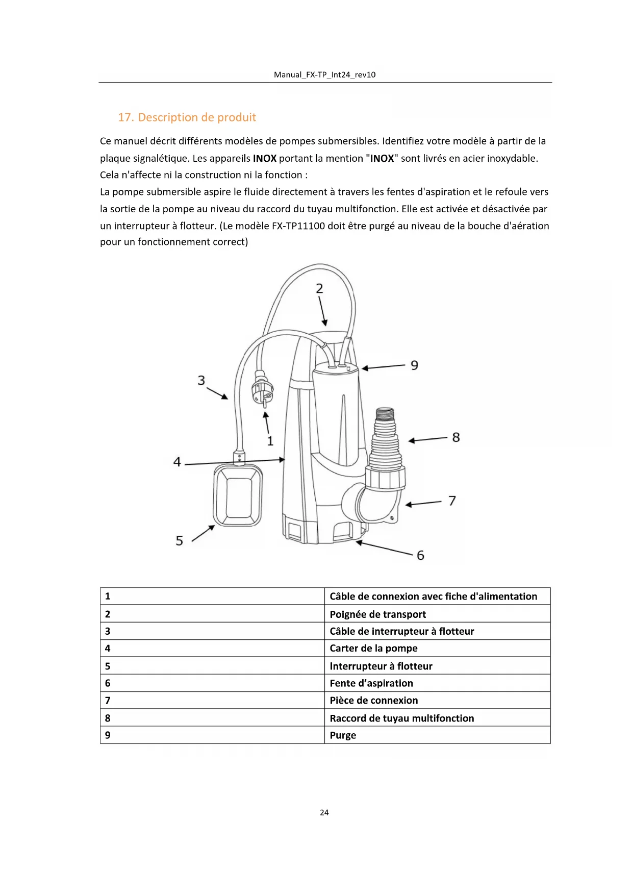Ce manuel décrit différents modès de pompes submersibles. Identifiez votre modèle à partir de la plaque signalétique. Les apparèils INOX portant la mention "INOX" sont livrés en acier inoxydable.