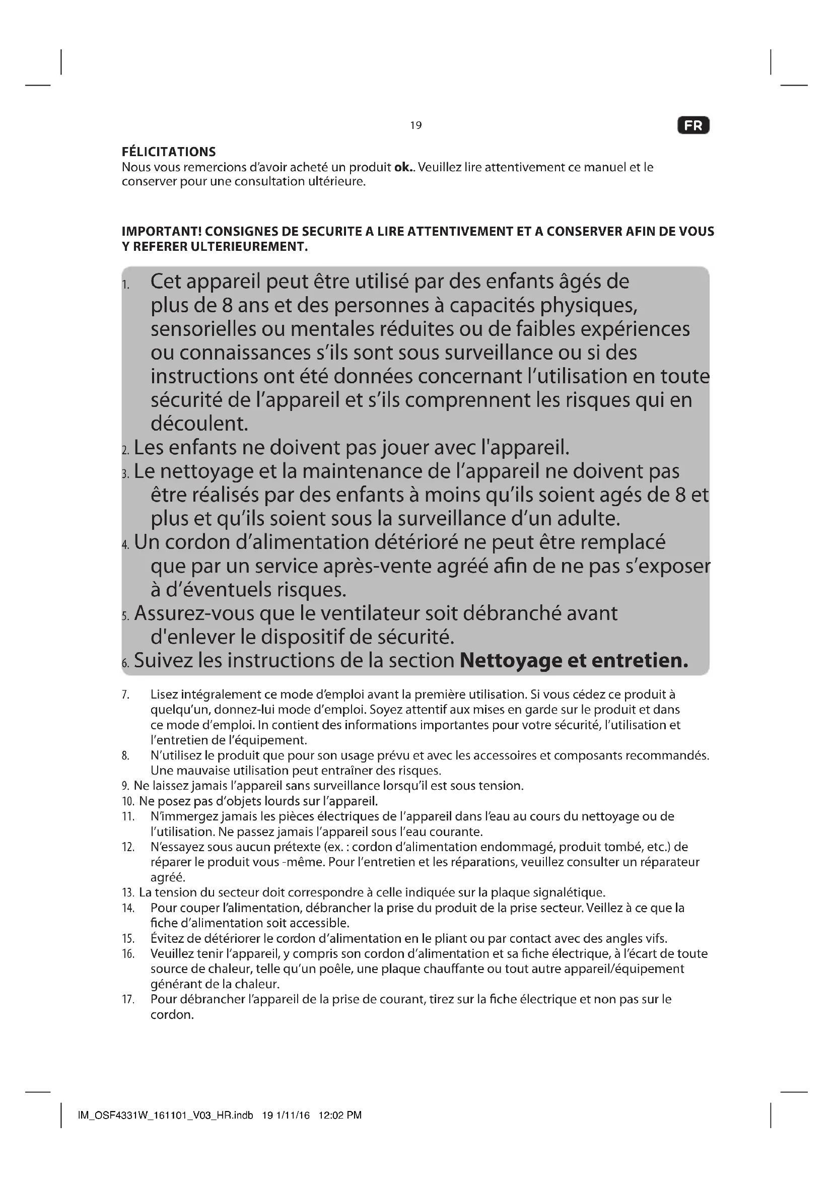 - Débrancher en cas de non-utilisation. DÉMONTAGE Démontez le ventilateur pour le nettoyage dans l’ordre inverse des étapes de montages. IM_OSF4331W_161101_V03_HR.indb 21 1/11/16 12:02 PM22