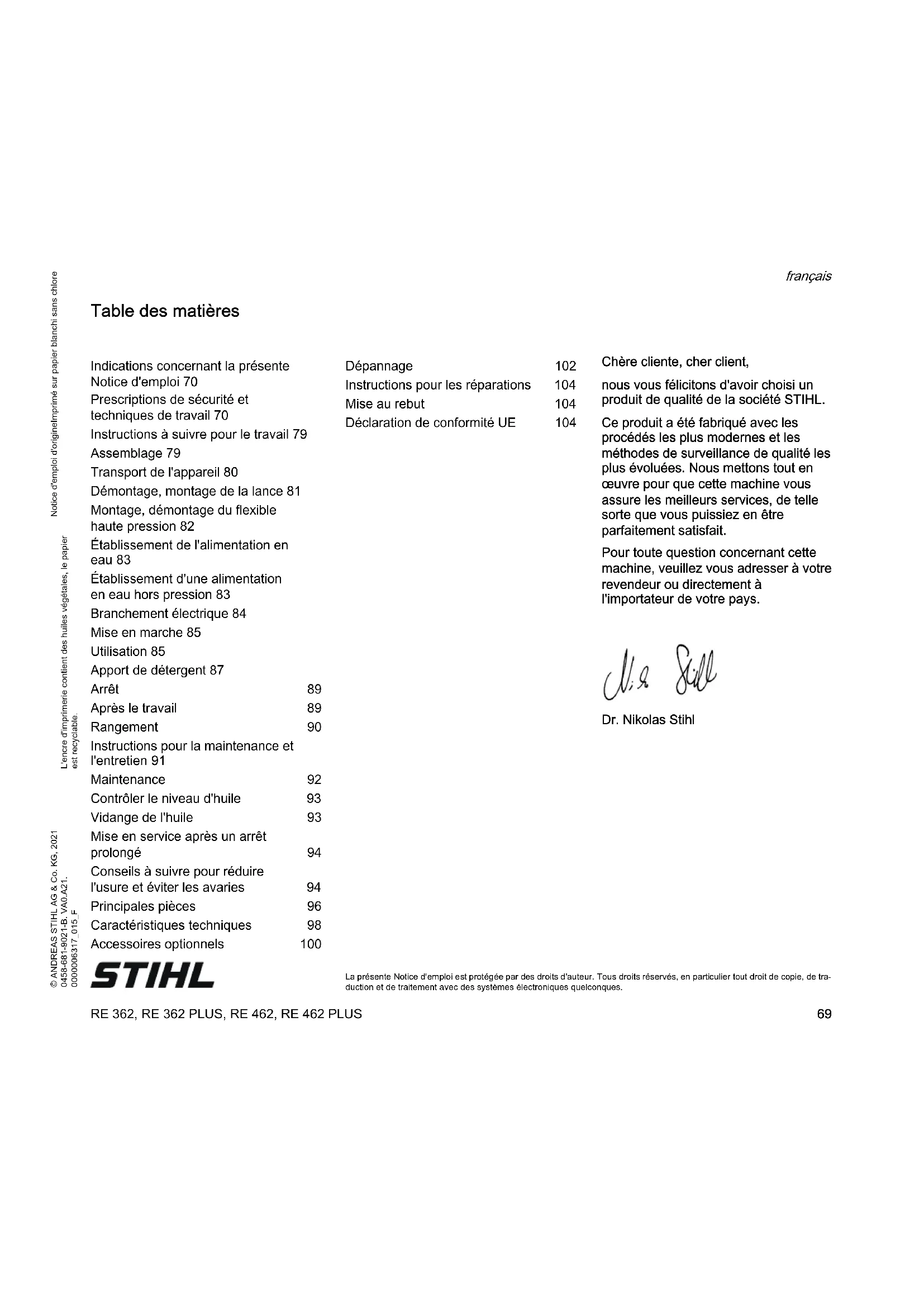 La présente Notice d'emploi est protégée par des droits d'auteur. Tous droits réservés, en particulier tout droit de copie, de tra- duction et de traitement avec des systèmes électroniques quelconques. Table des matières Chère cliente, cher client, nous vous félicitons d'avoir choisi un produit de qualité de la société STIHL. Ce produit a été fabriqué avec les procédés les plus modernes et les méthodes de surveillance de qualité les plus évoluées. Nous mettons tout en œuvre pour que cette machine vous assure les meilleurs services, de telle sorte que vous puissiez en être parfaitement satisfait. Pour toute question concernant cette machine, veuillez vous adresser à votre revendeur ou directement à l'importateur de votre pays. Dr. Nikolas Stihl Indications concernant la présente Notice d'emploi 70 Prescriptions de sécurité et techniques de travail 70 Instructions à suivre pour le travail 79 Assemblage 79 Transport de l'appareil 80 Démontage, montage de la lance 81 Montage, démontage du flexible haute pression 82 Établissement de l'alimentation en eau 83 Établissement d'une alimentation en eau hors pression 83 Branchement électrique 84 Mise en marche 85 Utilisation 85 Apport de détergent 87 Arrêt 89 Après le travail 89 Rangement 90 Instructions pour la maintenance et l'entretien 91 Maintenance 92 Contrôler le niveau d'huile 93 Vidange de l'huile 93 Mise en service après un arrêt prolongé 94 Conseils à suivre pour réduire l'usure et éviter les avaries 94 Principales pièces 96 Caractéristiques techniques 98 Accessoires optionnels 100 Dépannage 102 Instructions pour les réparations 104 Mise au rebut 104 Déclaration de conformité UE 104RE 362, RE 362 PLUS, RE 462, RE 462 PLUS français