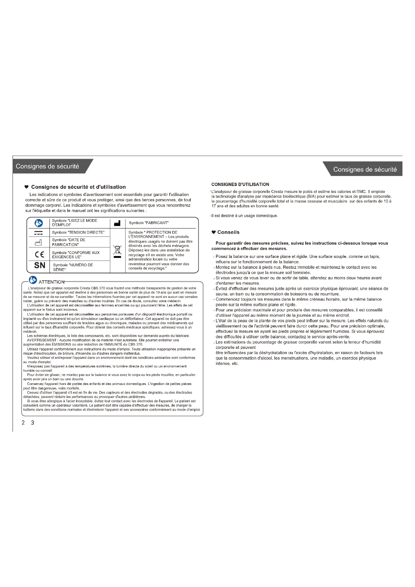L'analyseur de graisse corporelle Cresta CBS 370 vous fournit une méthode transparente de gestion de votre santé. Notez que cet appareil est destiné à des personnes en bonne santé de plus de 10 ans qui sont en mesure de se mesurer et de se surveiller. Toutes les informations fournies par cet appareil ne sont en aucun cas censées traiter, guérir ou prévenir des maladies ou d'autres troubles. En cas de doute, consultez votre médecin.