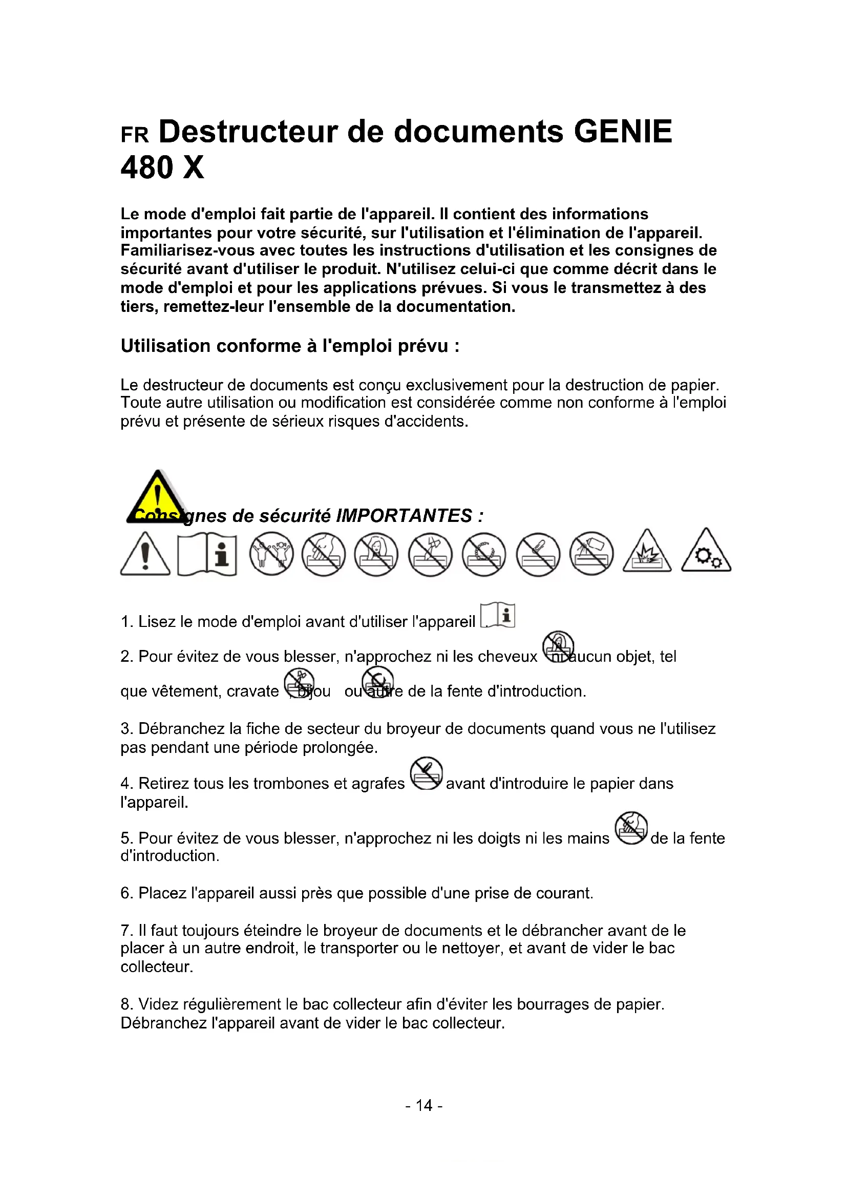 The device and packaging materials can be recycled; sort them for disposal to simplify waste management. The Triman logo is only relevant for France. Warranty Dear customer, We are delighted that you have chosen this equipment. In the case of a defect, please return the device together with the receipt and original packing material to the point of sale. Manufacturer: GO Europe GmbH Zum Kraftwerk 1 D-45527 Hattingen Germany www.go-europe.com- 14 - FR Destructeur de documents GENIE 480 X Le mode d'emploi fait partie de l'appareil. Il contient des informations importantes pour votre sécurité, sur l'utilisation et l'élimination de l'appareil. Familiarisez-vous avec toutes les instructions d'utilisation et les consignes de sécurité avant d'utiliser le produit. N'utilisez celui-ci que comme décrit dans le mode d'emploi et pour les applications prévues. Si vous le transmettez à des tiers, remettez-leur l'ensemble de la documentation. Utilisation conforme à l'emploi prévu : Le destructeur de documents est conçu exclusivement pour la destruction de papier. Toute autre utilisation ou modification est considérée comme non conforme à l'emploi prévu et présente de sérieux risques d'accidents.