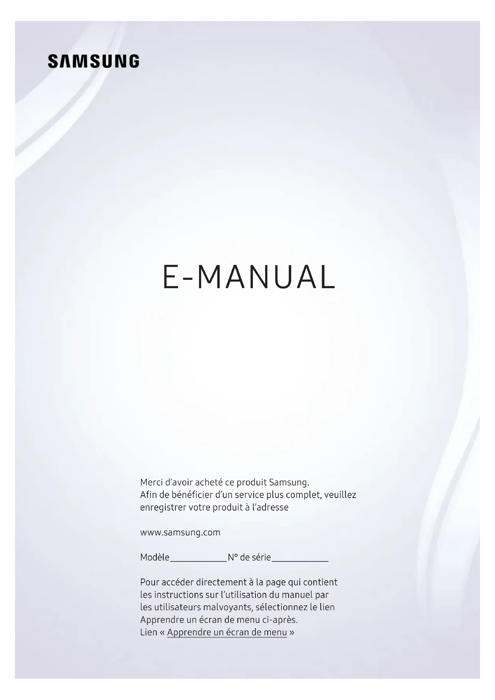 E-MANUAL Merci d’avoir acheté ce produit Samsung. Afin de bénéficier d’un service plus complet, veuillez enregistrer votre produit à l’adresse www.samsung.com M o d è l e __________________ N ° d e s é r i e __________________ Pour accéder directement à la page qui contient les instructions sur l’utilisation du manuel par les utilisateurs malvoyants, sélectionnez le lien Apprendre un écran de menu ci-après. Lien «Apprendre un écran de menu» FrançaisRésolution des problèmes de connectivité Internet 19 Résolution des problèmes de connectivité Internet Connexion de périphériques vidéo 21 Connexion à l'aide d'un câble HDMI 21 Connexion à l'aide d'un câble composant 22 Connexion à l'aide d'un câble composite (A/V) 23 Connexion avec un câble composant (modèles dotés d'un connecteur COMPONENT IN / AV IN uniquement) 24 Connexion avec un câble composite (modèles dotés d'un connecteur COMPONENT IN / AV IN uniquement) Connexions d'entrée et de sortie audio 25 Connexion à l'aide d'un câble HDMI (ARC) 25 Connexion à l'aide d'un câble audio numérique (optique) 25 Connexion au moyen d'un réseau sans fil 26 Connexion des périphériques Bluetooth Connexion à un ordinateur 26 Connexion via le port HDMI ― Partage d'écran (HDMI) Connexion de votre Périphérique mobile 27 Connexion du téléviseur via l’application SmartThings 28 Mise en miroir bidirectionnelle de votre téléviseur et de votre périphérique mobile à l’aide de l’application SmartThings 29 Gestion d'un périphérique mobile Basculement entre les différents périphériques externes connectés au téléviseur 29 Changement de signal d'entrée 30 Modification du nom et de l’icône d’un périphérique externe 31 Utilisation des autres fonctions Remarques sur la connexion 31 Remarque sur la connexion HDMI 32 Remarque sur la connexion des périphériques audio 32 Remarque sur la connexion des ordinateurs 33 Remarque sur la connexion des périphériques mobiles Guides de démarrage L'utilisation du Smart Hub Mise à jour du logiciel du téléviseur 9 Mise à niveau du logiciel du téléviseur vers la dernière version 9 Mise à jour automatique du téléviseur Obtention d’aide 10 Assistance via la fonction Gestion à distance 11 Recherche des coordonnées du service 11 Demande de service Connexions Guide de connexion Raccordement d'une antenne (Antenne) Connexion à Internet 14 Connexion à votre réseau Internet 16 Vérification de l’état de la connexion Internet 16 Redémarrage de votre réseau 16 Mise sous tension du téléviseur à l’aide d’un Périphérique mobile 16 Connexion d'un dispositif de contrôle IP au téléviseur. 17 Configuration d’une connexion Internet via IPv6 17 Modification du nom du téléviseur sur un réseau Connexion à un réseau au moyen d'un dongle mobile (Pour l'Inde uniquement) Sommaire 2Utilisation de l’application Galerie Utilisation de l’application Guide universel Utilisation de l’application SmartThings Utilisation de e-Manual 55 Lancement du e-Manual 56 Utilisation des boutons dans le e-Manual Utilisation de Internet Lecture des images/vidéos/fichiers musicaux 58 Lecture de contenu multimédia Visionnement du téléviseur Affichage des informations sur les diffusions numériques en bref 59 Utilisation du guide Enregistrement de programmes 61 Enregistrement de programmes 62 Gestion de la liste des enregistrements planifiés 63 Visionnage de programmes enregistrés 63 Configuration du démarrage d’un enregistrement planifié Configuration d'un Programmer visionnage 63 Configuration du visionnage des programmes d'une chaîne 64 Modification d'un visionnage programmé Utilisation de la fonction Timeshift Boutons et fonctions disponibles lors de l'enregistrement d'un programme ou avec Timeshift Utilisation de Liste des chaînes Périphériques Utilisation de la fonction Anynet+ (HDMI-CEC) 34 Connexion d’un périphérique externe via Anynet+ et utilisation des menus correspondants Commande du téléviseur à l’aide d’un clavier ou d’une souris 35 Connexion d’un clavier ou d’une souris USB 35 Connexion d’un clavier ou d’une souris Bluetooth 36 Utilisation du clavier et de la souris 37 Configuration des périphériques d’entrée Saisie de texte à l’aide du clavier virtuel à l’écran Fonctions Smart Smart Hub 40 Affichage de l’Barre d'accès rapide 44 Lancement automatique de Smart Hub 44 Lancement automatique de la dernière application utilisée 44 Test des connexions Smart Hub 44 Réinitialisation de Smart Hub Utilisation d'un compte Samsung 45 Création et gestion de votre compte Samsung 46 Ouverture d'un compte Samsung Utilisation du service Mes Applications 49 Installation et exécution d'une application 50 Gestion des applications achetées ou installées 3Image et Son Réglage de la qualité des images 76 Sélection du mode d'image 77 Configuration des paramètres d'image avancés Configuration de l’environnement d’affichage des périphériques externes 78 Jouer à des jeux sur un écran optimisé 78 Configuration des détails du mode jeu 79 Utilisation du niveau de noir HDMI Fonctions de prise en charge des images 79 Modification du format de l'image 80 Modification automatique du format d'image 80 Basculement du format d'image sur le mode 4:3 ou Adapter à l'écran 80 Adaptation de l'image à l'écran 80 Réglage de la taille et/ou de l'emplacement de l'image Configuration du Mode Son et des Paramètres expert 81 Sélection du mode son 81 Configuration des paramètres audio avancés Utilisation des fonctions de prise en charge du son 82 Choix des haut-parleurs 82 Diffusion du son du téléviseur via un appareil Bluetooth 83 Diffusion du son du téléviseur via un périphérique audio Samsung qui prend en charge la fonction Wi-Fi Modification de chaînes 68 Suppression de chaînes enregistrées 68 Modification de chaînes enregistrées Création d'une liste de chaînes favorites personnalisée 