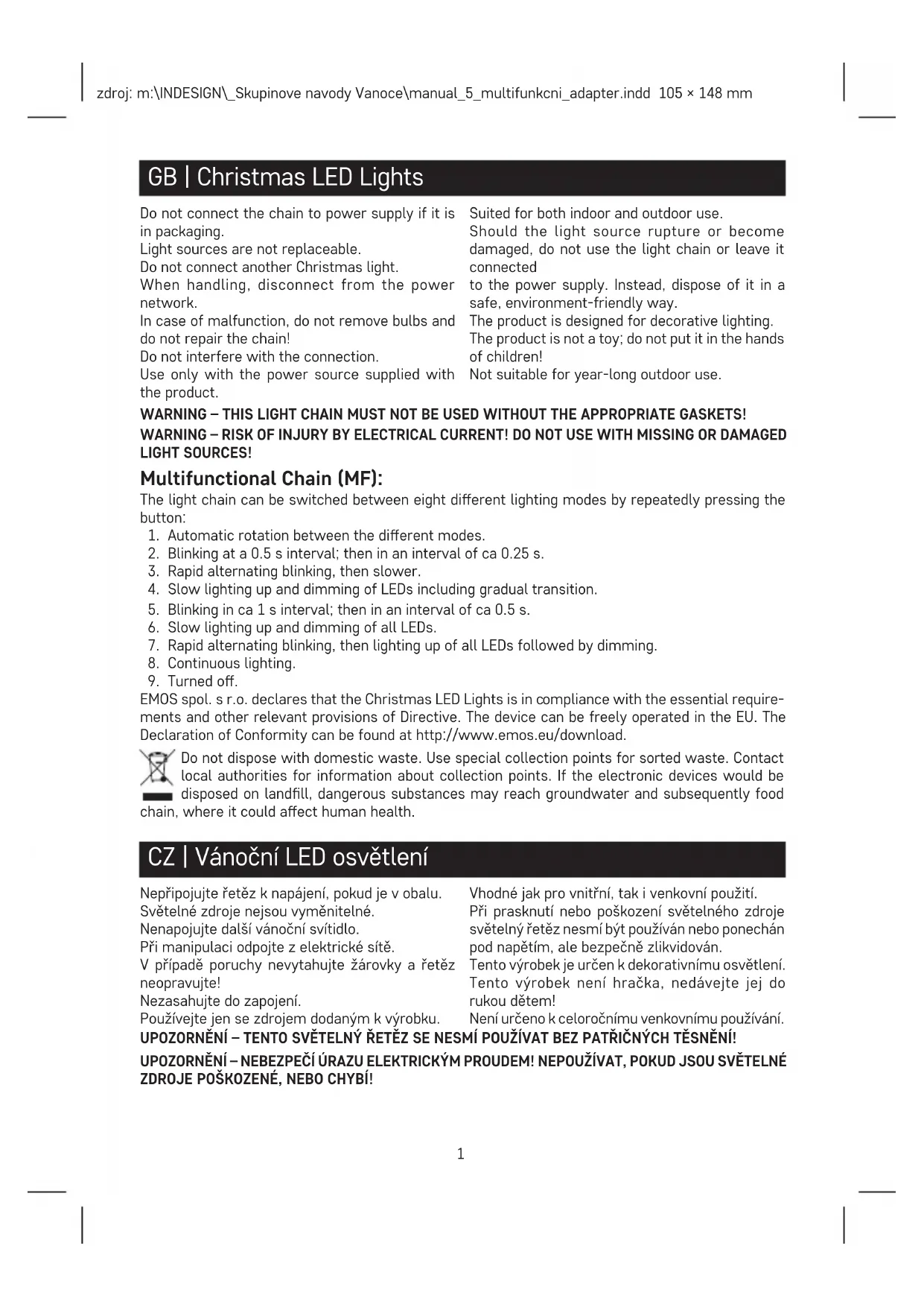 EMOS spol. s r.o. декларира, че Коледни Led Лампички отговаря на основните изисквания и други разпоредби на Директива. Оборудването може да се използва свободно в рамките на ЕС. Декла- рацията за съответствие е част от това ръководство и може да бъде намерена също на уебсайта http://www.emos.eu/download. Не изхвърляйте електрически уреди с несортираните домакински отпадъци; предавайте ги в пунктовете за събиране на сортирани отпадъци. Актуална информация относно пункто- вете за събиране на сортирани отпадъци може да получите от компетентните местни орга- ни. При изхвърляне на електрически уреди на сметищата е възможно в подпочвените води да попаднат опасни вещества, които след това да преминат в хранителната верига и да увредят здравето на хората. FR | Luminaire de Noël LED Ne connectez pas la chaîne à l‘alimentation élec- trique si elle est dans son emballage. Les sources lumineuses ne sont pas rempla- çables. Ne connectez pas une autre lumière de Noël. Lors de la manipulation, déconnectez-vous du réseau électrique. En cas de dysfonctionnement, ne retirez pas les ampoules et ne réparez pas la chaîne! N‘interférez pas avec la connexion. Utilisez uniquement avec la source d‘alimentation fournie avec le produit. Convient pour une utilisation intérieure et extérieure. En cas de rupture ou d‘endommagement de la source lumineuse, n‘utilisez pas la chaîne légère et ne la laissez pas branchée à l‘alimentation11 électrique. Au lieu de cela, jetez-le de manière sûre et respectueuse de l‘environnement. Le produit est conçu pour un éclairage décoratif. Le produit n‘est pas un jouet; ne le mettez pas entre les mains des enfants! Ne convient pas pour une utilisation en extérieur pendant un an. AVERTISSEMENT – CETTE CHAÎNE D‘ÉCLAIRAGE NE DOIT PAS ÊTRE UTILISÉE SANS LES JOINTS APPROPRIÉS! AVERTISSEMENT – RISQUE DE BLESSURE PAR COURANT ÉLECTRIQUE! NE PAS UTILISER AVEC DES SOURCES LUMINEUSES MANQUANTES OU ENDOMMAGÉES! Chaîne multifonctionnelle (MF): La lumière chaîne peut être commuté entre huit di érents éclairage modes de façon répétée en appuyant sur le bouton: