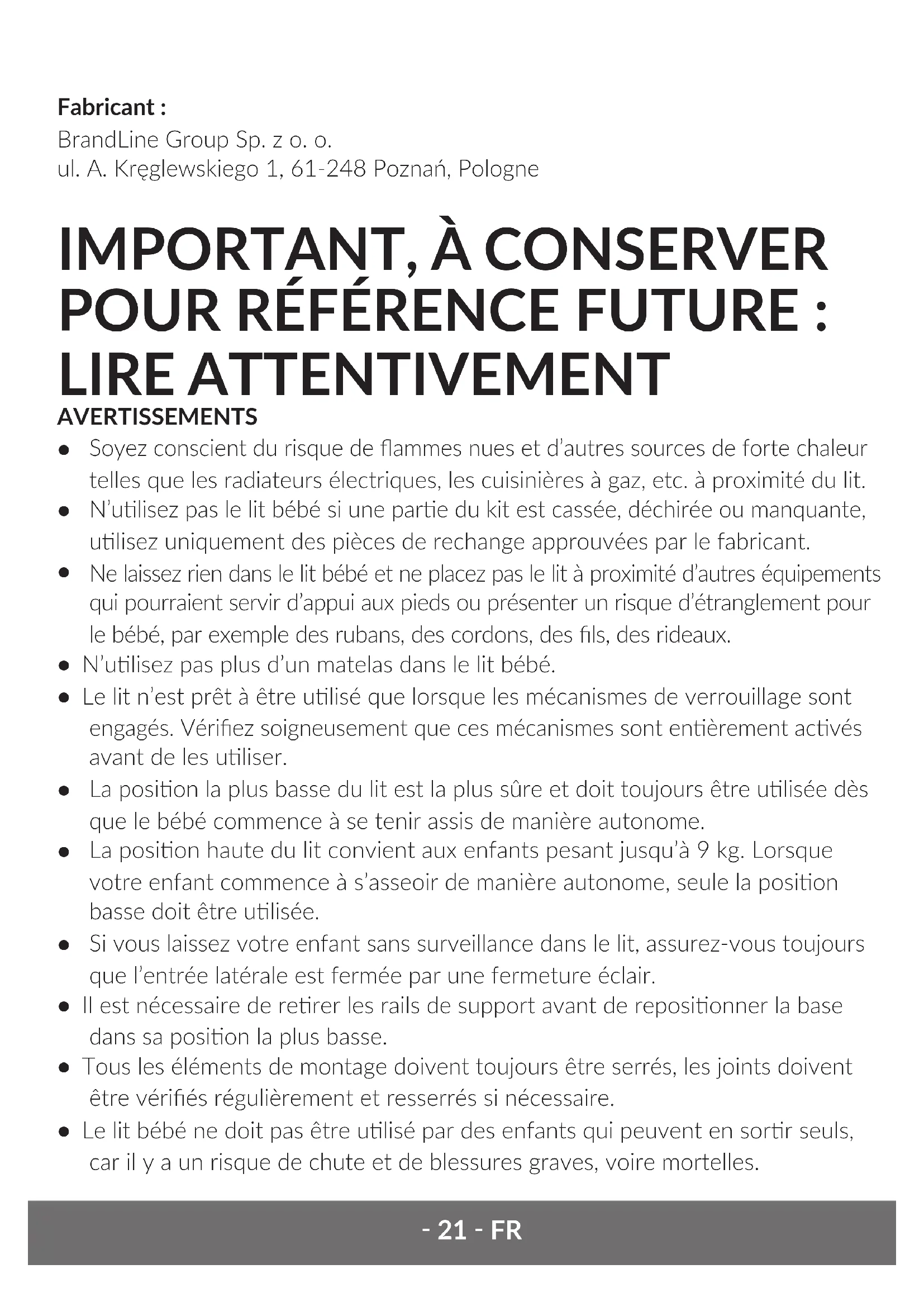- Le lit bébé ne doit pas être ulisé par des enfants qui peuvent en sorr seuls, car il y a un risque de chute et de blessures graves, voire mortelles.‑ 22 ‑FR