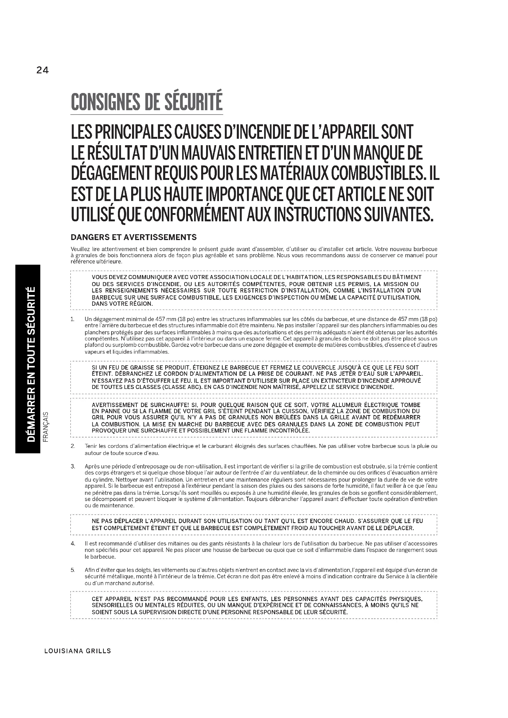Il n'y a aucune garantie de performance écrite ou implicite sur les appareils Louisiana Grills®, car le fabricant n'a aucun contrôle sur l'installation, le fonctionnement, le nettoyage, l'entretien ou le type de carburant brûlé. La présente garantie ne s'appliquera pas et Dansons n'assumera aucune responsabilité si votre appareil n'a pas été installé, utilisé, nettoyé et entretenu en toute conformité avec ce manuel. La combustion d'autre carburant que des granules de bois de qualité peut annuler la garantie. La garantie ne couvre pas les dommages ou les bris dus à un usage inapproprié, à une mauvaise utilisation ou à des modifications.