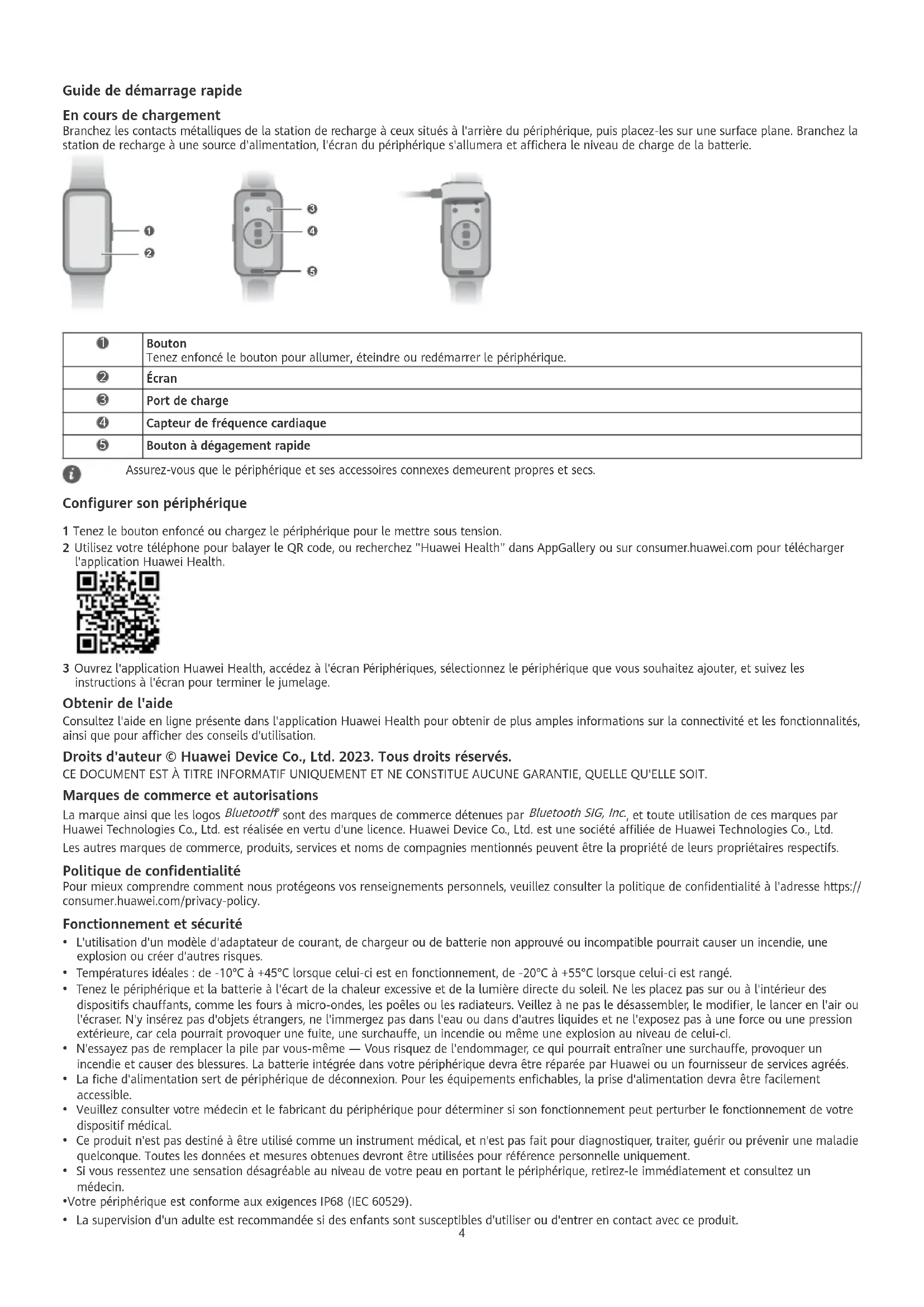 Bouton à dégagement rapide Assurez-vous que le périphérique et ses accessoires connexes demeurent propres et secs. Congurer son périphérique 1 Tenez le bouton enfoncé ou chargez le périphérique pour le mettre sous tension. 2 Utilisez votre téléphone pour balayer le QR code, ou recherchez "Huawei Health" dans AppGallery ou sur consumer.huawei.com pour télécharger l'application Huawei Health. 3 Ouvrez l'application Huawei Health, accédez à l'écran Périphériques, sélectionnez le périphérique que vous souhaitez ajouter, et suivez les instructions à l'écran pour terminer le jumelage. Obtenir de l'aide Consultez l'aide en ligne présente dans l'application Huawei Health pour obtenir de plus amples informations sur la connectivité et les fonctionnalités, ainsi que pour acher des conseils d'utilisation. Droits d'auteur © Huawei Device Co., Ltd. 2023. Tous droits réservés. CE DOCUMENT EST À TITRE INFORMATIF UNIQUEMENT ET NE CONSTITUE AUCUNE GARANTIE, QUELLE QU'ELLE SOIT. Marques de commerce et autorisations La marque ainsi que les logos Bluetooth