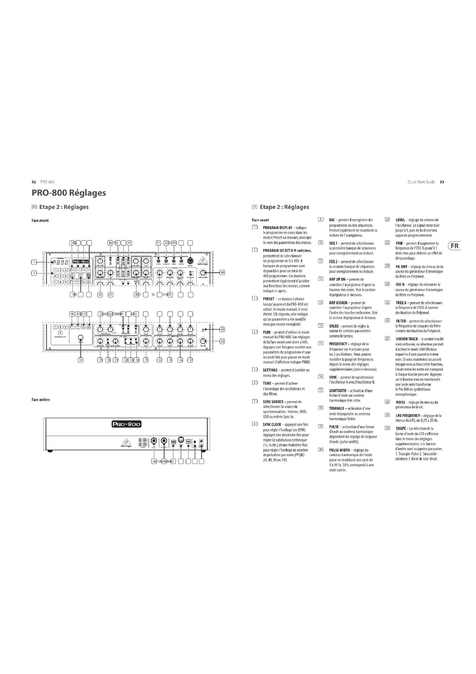 (FR) Etape 2 : Réglages Face avant Face arrière 32 33Quick Start GuidePRO-800 Face avant (1) PROGRAM DISPLAY – indique le programme en cours dans les modes Preset ou manuel, ainsi que le nom des paramètres des menus. (2) PROGRAM SELECT 0-9 switches. permettent de sélectionner un programme de 0 à 100. 4 banques de programmes sont disponibles pour un total de 400 programmes. Ces boutons permettent également d’accéder aux fonctions des menus, comme indiqué ci-après. (3) PRESET – ce bouton s’allume lorsqu’un preset du PRO-800 est utilisé. En mode manuel, il reste éteint. S’il clignote, cela indique qu’un paramètre a été modié mais pas encore enregistré. (4) PERF – permet d’utiliser le mode manuel du PRO-800. Les réglages de la face avant sont alors actifs. Appuyez une fois pour accéder aux paramètres du programme et une seconde fois pour passer en mode manuel (l’acheur indique P800). (5) SETTINGS – permet d’accéder au menu des réglages. (6) TUNE – permet d’activer l’accordage des oscillateurs et des ltres. (7) SYNC SOURCE – permet de sélectionner la source de synchronisation : interne, MIDI, USB ou entrée Sync In. (8) SYNC CLOCK – appuyez une fois pour régler l’horloge (en BPM). Appuyez une deuxième fois pour régler la subdivision rythmique (¼, ⁄ etc.) et une troisième fois pour régler l’horloge en nombre de pulsation par noire (PPQN) : 24, 48, 96 ou 192. (9) REC – permet d’enregistrer des programmes ou des séquences. Permet également de maintenir la lecture de l’arpégiateur. (10) SEQ 1 – permet de sélectionner la première banque de séquences pour enregistrement ou lecture. (11) SEQ 2 – permet de sélectionner la seconde banque de séquences pour enregistrement ou lecture. (12) ARP UP DN – permet de contrôler l’arpégiateur d’après la hauteur des notes. Voir la section Arpégiateur ci-dessous. (13) ARP ASSIGN – permet de contrôler l’arpégiateur d’après l’ordre des touches enfoncées. Voir la section Arpégiateur ci-dessous. (14) VALUE – permet de régler la valeur de certains paramètres comme le tempo. (15) FREQUENCY – réglage de la fréquence sur 4 octaves pour les 2 oscillateurs. Vous pouvez modier la plage de fréquences depuis le menu des réglages supplémentaires (voir ci-dessous). (16) SYNC – permet de synchroniser l’oscillateur A avec l’oscillateur B. (17) SAWTOOTH – activation d’une forme d’onde au contenu harmonique très riche. (18) TRIANGLE – activation d’une onde triangulaire au contenu harmonique faible. (19) PULSE – activation d’une forme d’onde au contenu harmonique dépendant du réglage de largueur d’onde (pulse width). (20) PULSE WIDTH – réglage du contenu harmonique de l’onde pulse en modiant son cycle de 1 à 99 %. 50% correspond à une onde carrée. (21) LEVEL – réglage du volume de l’oscillateur. Le signal reste clair jusqu’à 5, puis de la distorsion apparait progressivement. (22) FINE – permet d’augmenter la fréquence de l’OSC B jusqu’à 1 demi-ton pour obtenir un eet de désaccordage. (23) FIL ENV – réglage du niveau de la source du générateur d’enveloppe du ltre en Polymod. (24) OSC B – réglage du niveau de la source du générateur d’enveloppe du ltre en Polymod. (25) FREQ A – permet de sélectionner la fréquence de l’OSC A comme destination du Polymod. (26) FILTER – permet de sélectionner la fréquence de coupure du ltre comme destination du Polymod. (27) UNISON TRACK – si aucune touche n’est enfoncée, ce sélecteur permet d’activer le mode UNISON dans lequel les 8 voix jouent la même note. Si vous maintenez un accord lorsque vous activez cette fonction, l’écart entre les notes est transposé à chaque touche pressée. Appuyer sur le bouton tout en maintenant une seule note transforme le Pro 800 en synthétiseur monophonique. (28) NOISE – réglage du niveau du générateur de bruit. (29) LFO FREQUENCY – réglage de la vitesse du LFO, de 0,25 à 20 Hz. (30) SHAPE – La sélection de la forme d’onde du LFO s’eectue dans le menu des réglages supplémentaires. Les formes d’ondes sont assignées par paires.