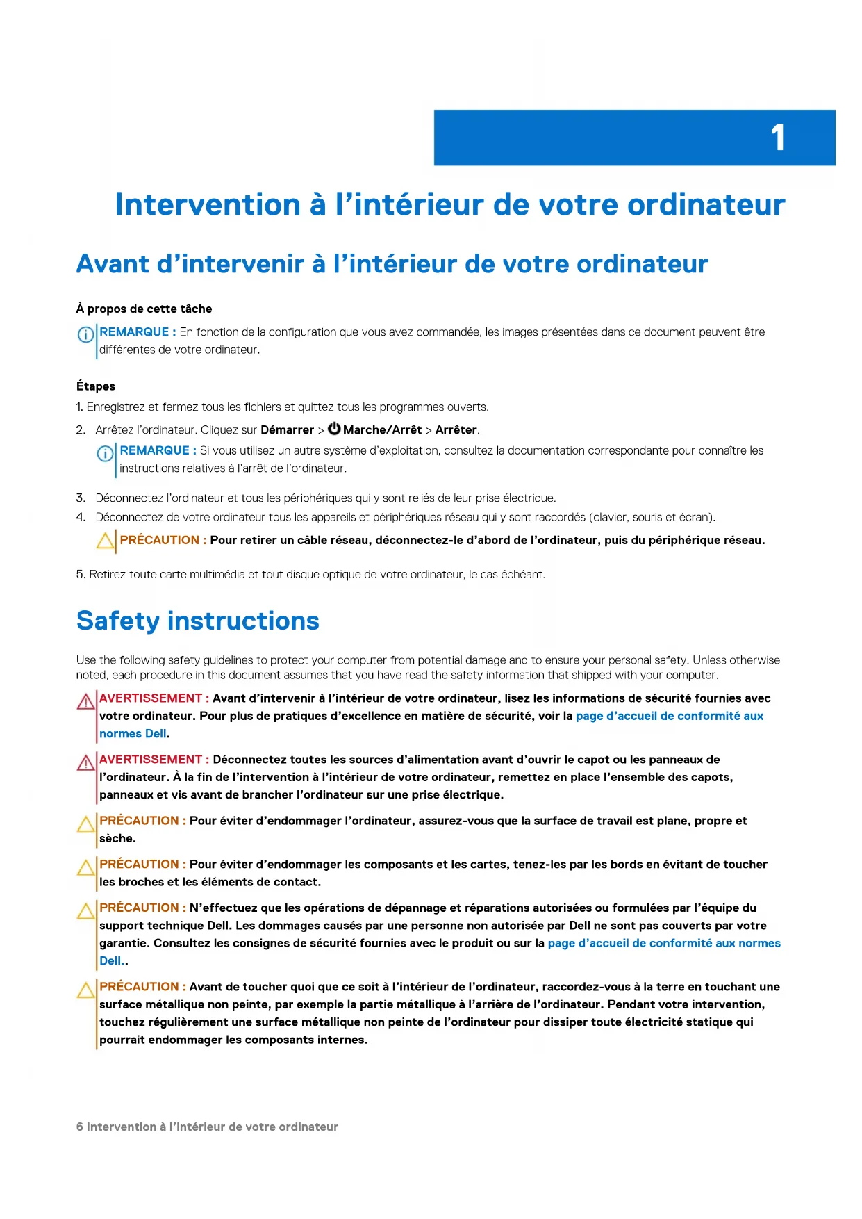 l’ordinateur. À la fin de l’intervention à l’intérieur de votre ordinateur, remettez en place l’ensemble des capots, panneaux et vis avant de brancher l’ordinateur sur une prise électrique. PRÉCAUTION : Pour éviter d’endommager l’ordinateur, assurez-vous que la surface de travail est plane, propre et sèche. PRÉCAUTION : Pour éviter d’endommager les composants et les cartes, tenez-les par les bords en évitant de toucher les broches et les éléments de contact. PRÉCAUTION : N’effectuez que les opérations de dépannage et réparations autorisées ou formulées par l’équipe du support techniqueDell. Les dommages causés par une personne non autorisée par Dell ne sont pas couverts par votre garantie. Consultez les consignes de sécurité fournies avec le produit ou sur la page d’accueil de conformité aux normes Dell.. PRÉCAUTION : Avant de toucher quoi que ce soit à l’intérieur de l’ordinateur, raccordez-vous à la terre en touchant une surface métallique non peinte, par exemple la partie métallique à l’arrière de l’ordinateur. Pendant votre intervention, touchez régulièrement une surface métallique non peinte de l’ordinateur pour dissiper toute électricité statique qui pourrait endommager les composants internes.