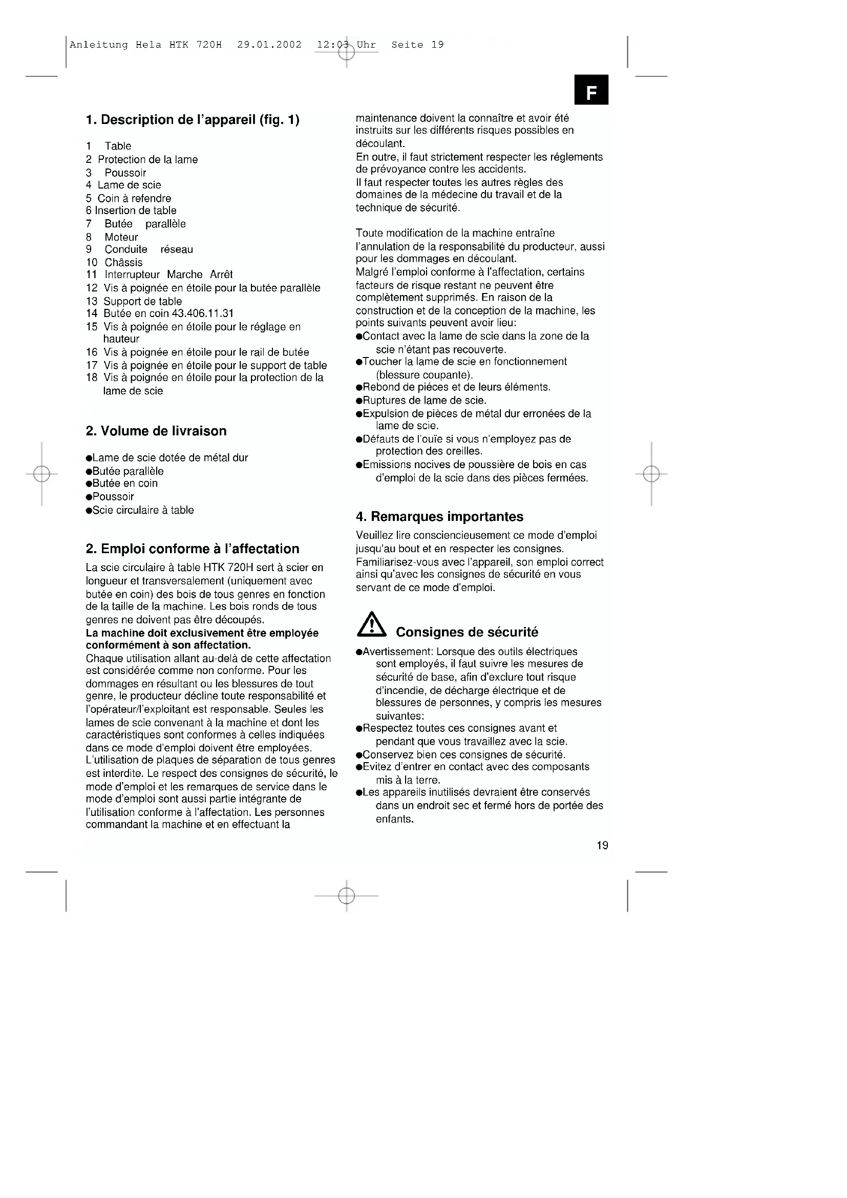 La scie circulaire à table HTK 720H sert à scier en longueur et transversalement (uniquement avec butée en coin) des bois de tous genres en fonction de la taille de la machine. Les bois ronds de tous genres ne doivent pas être découpés. La machine doit exclusivement être employée conformément à son affectation. Chaque utilisation allant au-delà de cette affectation est considérée comme non conforme. Pour les dommages en résultant ou les blessures de tout genre, le producteur décline toute responsabilité et l’opérateur/l’exploitant est responsable. Seules les lames de scie convenant à la machine et dont les caractéristiques sont conformes à celles indiquées dans ce mode d’emploi doivent être employées. L’utilisation de plaques de séparation de tous genres est interdite. Le respect des consignes de sécurité, le mode d’emploi et les remarques de service dans le mode d’emploi sont aussi partie intégrante de l’utilisation conforme à l’affectation. Les personnes commandant la machine et en effectuant la maintenance doivent la connaître et avoir été instruits sur les différents risques possibles en découlant. En outre, il faut strictement respecter les réglements de prévoyance contre les accidents. Il faut respecter toutes les autres règles des domaines de la médecine du travail et de la technique de sécurité. Toute modification de la machine entraîne l’annulation de la responsabilité du producteur, aussi pour les dommages en découlant. Malgré l’emploi conforme à l’affectation, certains facteurs de risque restant ne peuvent être complètement supprimés. En raison de la construction et de la conception de la machine, les points suivants peuvent avoir lieu: Contact avec la lame de scie dans la zone de la scie n’étant pas recouverte. Toucher la lame de scie en fonctionnement (blessure coupante). Rebond de piéces et de leurs éléments. Ruptures de lame de scie. Expulsion de pièces de métal dur erronées de la lame de scie. Défauts de l’ouïe si vous n’employez pas de protection des oreilles. Emissions nocives de poussière de bois en cas d’emploi de la scie dans des pièces fermées.