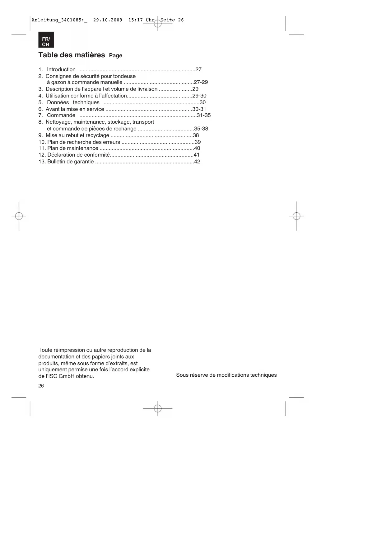 Toute réimpression ou autre reproduction de la documentation et des papiers joints aux produits, même sous forme d’extraits, est uniquement permise une fois l’accord explicite de l’ISC GmbH obtenu. Sous réserve de modifications techniques Anleitung_3401085:_ 29.10.2009 15:17 Uhr Seite 26FR/