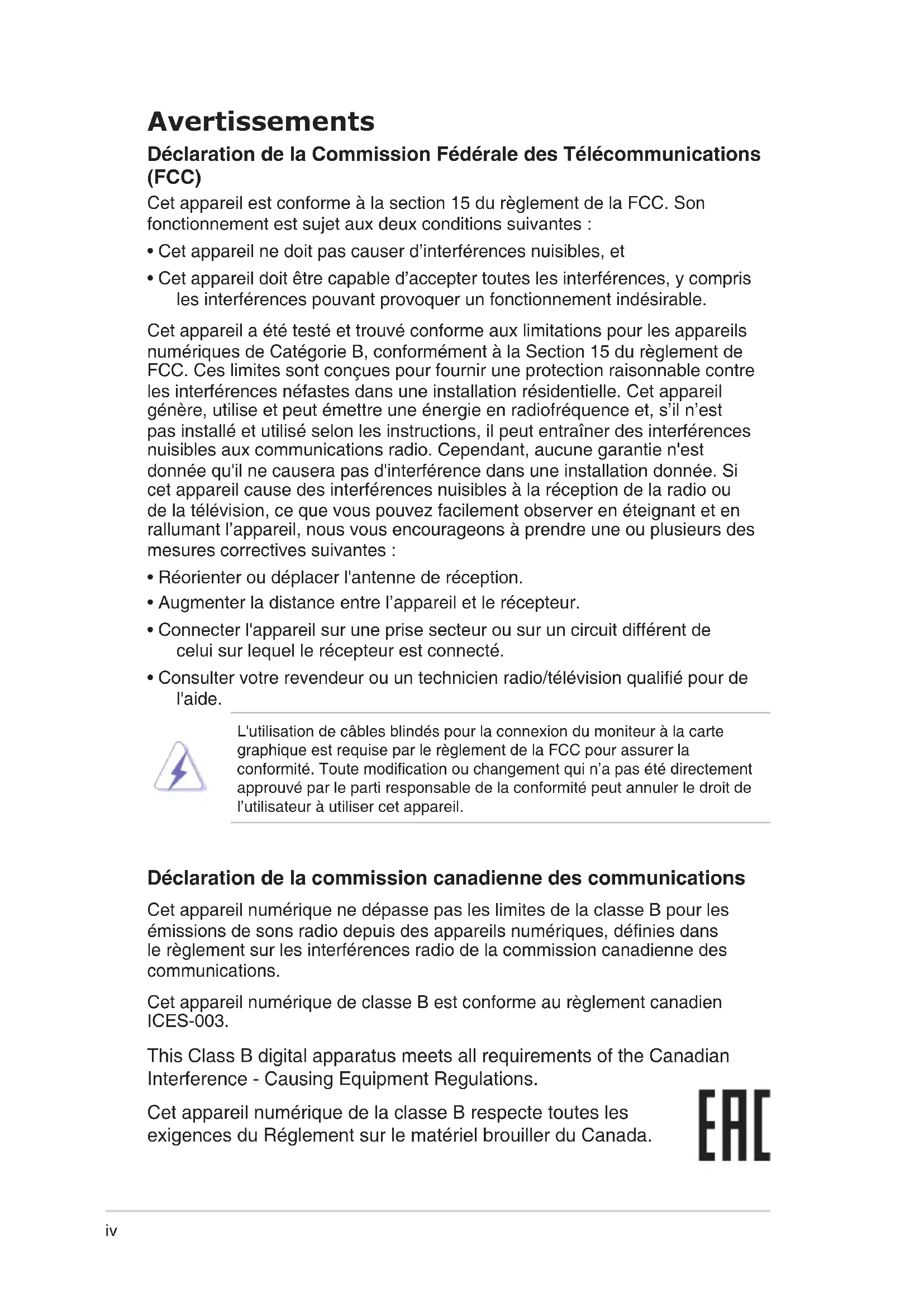 - Consulter votre revendeur ou un technicien radio/télévision qualifié pour de l'aide. L'utilisation de câbles blindés pour la connexion du moniteur à la carte graphique est requise par le règlement de la FCC pour assurer la conformité. Toute modification ou changement qui n’a pas été directement approuvé par le parti responsable de la conformité peut annuler le droit de l’utilisateur à utiliser cet appareil. Déclaration de la commission canadienne des communications Cet appareil numérique ne dépasse pas les limites de la classe B pour les émissions de sons radio depuis des appareils numériques, définies dans le règlement sur les interférences radio de la commission canadienne des communications. Cet appareil numérique de classe B est conforme au règlement canadien ICES-003. This Class B digital apparatus meets all requirements of the Canadian Interference - Causing Equipment Regulations. Cet appareil numérique de la classe B respecte toutes les exigences du Réglement sur le matériel brouiller du Canada.v Informations de sécurité