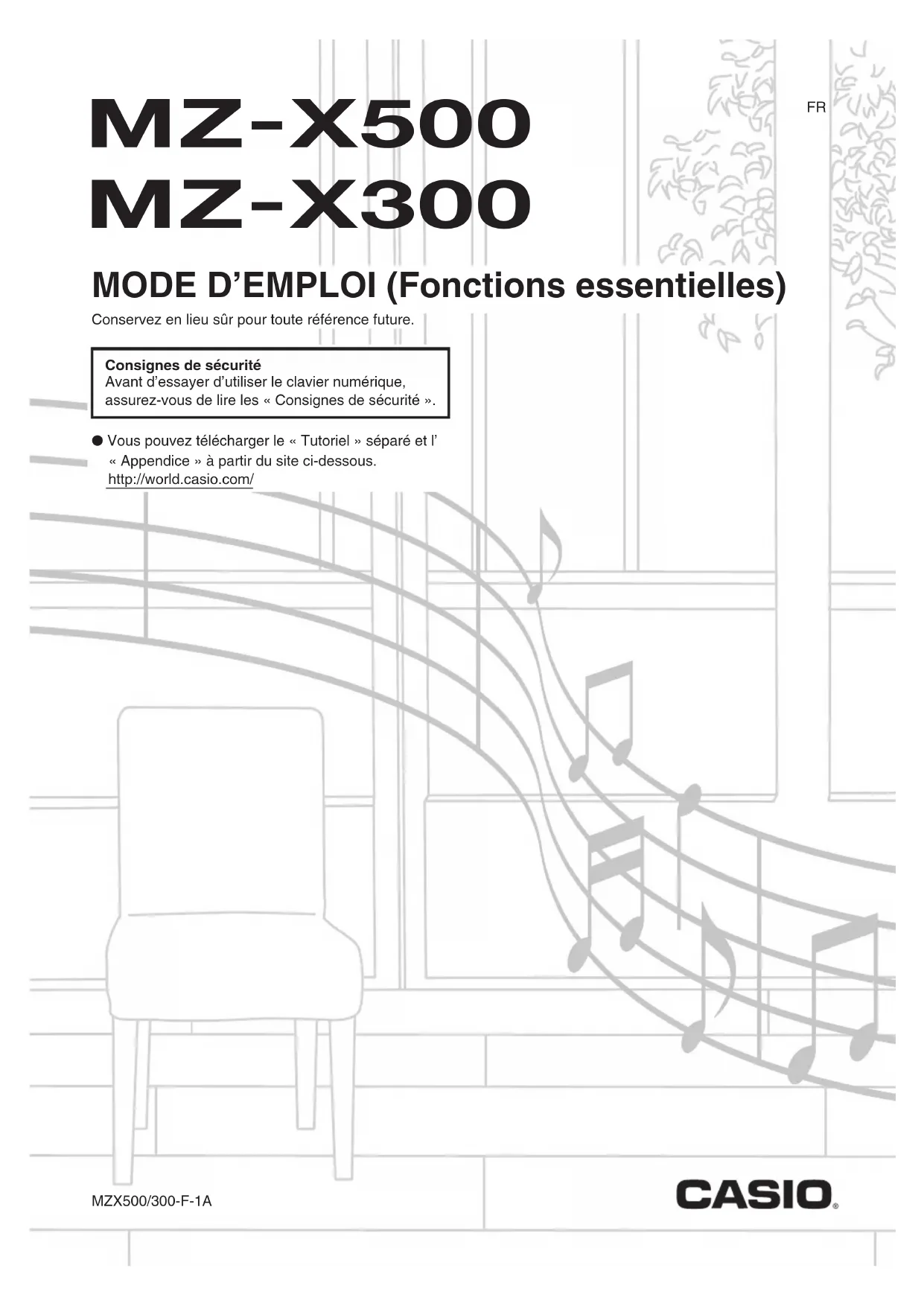 - Ne pas oublier de débrancher l’adaptateur secteur avant de nettoyer le produit. Manufacturer: CASIO COMPUTER CO., LTD. 6-2, Hon-machi 1-chome, Shibuya-ku, Tokyo 151-8543, Japan Responsible within the European Union: Casio Europe GmbH Casio-Platz 1, 22848 Norderstedt, Germany www.casio-europe.com Déclaration de conformité à la Directive de l’Union Européenne FR-1 MZX300_X500-F-1A.indd 3 2015/10/09 16:58:41FR-2 Sommaire Guide général FR-4 Installation du pupitre à musique . . . . . . . . . . . FR-6 Rétablissement des réglages par défaut du clavier numérique. . . . . . . . . . . . . . FR-6 Tutoriel séparé . . . . . . . . . . . . . . . . . . . . . . . . . FR-6 Prise d’alimentation FR-7 Utilisation d’un adaptateur secteur . . . . . . . . . . FR-7 Mise sous et hors tension . . . . . . . . . . . . . . . . . FR-7 Raccordements FR-9 Raccordement d’un casque d’écoute . . . . . . . . FR-9 Raccordement d’un appareil audio ou d’un amplificateur. . . . . . . . . . . . . . . . . . . . . . . . . . FR-9 Accessoires fournis et optionnels . . . . . . . . . . FR-11 Opérations communes à tous les modes FR-12 Utilisation de l’écran d’affichage . . . . . . . . . . . FR-12 Fonctionnement . . . . . . . . . . . . . . . . . . . . . . . FR-13 Morceau de démonstration FR-16 Écoute des morceaux de démonstration. . . . . FR-16 Utilisation de différentes sonorités FR-17 Sélection d’une sonorité avec les touches TONE . . . . . . . . . . . . . . . . . . . . . . . FR-17 Partage du clavier entre deux sonorités . . . . . FR-17 Superposition de deux sonorités. . . . . . . . . . . FR-19 Réglage de la balance sonore du clavier . . . . FR-19 Utilisation du métronome . . . . . . . . . . . . . . . . FR-19 Changement de réglage du tempo . . . . . . . . . FR-20 Exécution automatique de phrases arpégées (Arpégiateur) . . . . . . . . . . . . . . . . FR-21 Contrôle des sons FR-22 Utilisation d’une pédale. . . . . . . . . . . . . . . . . . FR-22 Notes prolongées . . . . . . . . . . . . . . . . . . . . . . FR-23 Utilisation de la molette de variation de la hauteur des notes . . . . . . . . . . . . . . . . FR-23 Modification de notes avec la molette de modulation et/ou les boutons ronds . . . . FR-23 Utilisation des curseurs. . . . . . . . . . . . . . . . . . FR-24 Changement de la hauteur des notes (Transposition, Décalage d’octaves) . . . . . . FR-25 Utilisation de l’accompagnement automatique FR-27 Reproduction d’un accompagnement automatique . . . . . . . . . . . . . . . . . . . . . . . . . FR-27 Utilisation des sonorités et tempos recommandés (Préréglages instantanés) . . FR-31 Ajout d’harmoniques aux notes de la mélodie (Harmonisation automatique). . . . . . . . . . . . FR-31 Utilisation des pads FR-32 Lecture de phrases courtes. . . . . . . . . . . . . . . FR-32 Reproduction de sons échantillonnés . . . . . . . FR-33 Spécification d’une progression d’accords pour l’accompagnement automatique (jeu d’accord) (MZ-X500 uniquement) . . . . . FR-33 Attribution de diverses fonction (MZ-X500 uniquement) . . . . . . . . . . . . . . . . FR-34 Changement de la fonction d’un pad spécifique . . . . . . . . . . . . . . . . . . . . . . . . . . . FR-34 Changement des réglages de pad . . . . . . . . . FR-35 Sauvegarde d’une banque . . . . . . . . . . . . . . . FR-35 Arrêt de la lecture de tous les pads. . . . . . . . . FR-35 Synchronisation des pads avec l’accompagnement . . . . . . . . . . . . . . . . . . . . FR-36 Enregistrement de données sur un pad . . . . . FR-36 Préréglages musicaux FR-38 Rappel des données d’un préréglage . . . . . . . FR-38 Enregistrement de configurations de sonorités et de rythmes (Consignation) FR-39 Enregistrement et lecture FR-41 Enregistrement dans la mémoire du clavier numérique (Enregistreur MIDI). . . . . . . . . . . FR-43 Enregistrement sur une clé USB (Enregistreur audio) . . . . . . . . . . . . . . . . . . . FR-46 Paramétrage du clavier numérique FR-49 Paramétrage du clavier numérique . . . . . . . . . FR-49 Clé USB FR-61 Branchement et débranchement d’une clé USB du clavier numérique . . . . . . . . . . . . . . FR-62 Formatage d’une clé USB . . . . . . . . . . . . . . . . FR-63 Sauvegarde des données d’un morceau standard sur une clé USB . . . . . . . . . . . . . . FR-63 Sauvegarde des données du clavier numérique sur une clé USB . . . . . . . . . . . . . FR-63 Transfert des données d’une clé USB dans la mémoire du clavier numérique . . . . FR-64 Suppression des données d’une clé USB. . . . FR-64 Raccordement à un ordinateur FR-65 Configuration système minimale de l’ordinateur . . . . . . . . . . . . . . . . . . . . . . . . . . FR-65 Utilisation de MIDI . . . . . . . . . . . . . . . . . . . . . . FR-66 MZX300_X500-F-1A.indd 4 2015/10/09 16:58:42Sommaire FR-3 Référence FR-67 Messages d’erreur . . . . . . . . . . . . . . . . . . . . . FR-67 En cas de problème . . . . . . . . . . . . . . . . . . . . FR-68 Fiche technique. . . . . . . . . . . . . . . . . . . . . . . . FR-70 Précautions d’emploi. . . . . . . . . . . . . . . . . . . . FR-72 Informations A-1 Guide des doigtés ................................................A-1 Liste des exemples d’accords..............................A-3 Les noms de société et de produits mentionnés dans ce manuel peuvent être des marques déposées de tiers. MZX300_X500-F-1A.indd 5 2015/10/09 16:58:42FR-4 Guide général