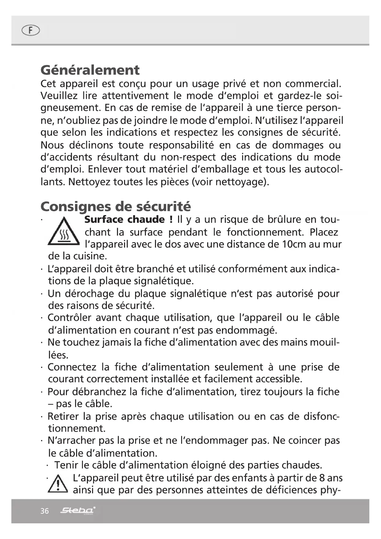 Attention ! L´extérieur de l´appareil devient chauds. Risque de brûlures. Pendant le fonctionne- ment, la température des surfaces touchables peut être très chaude ! Ne pas déposez l’appareil sur une surface sensible et le posez de sorte qu’il ait au moins 70 cm de place libre des matières inflammables. ∙ Vapeur peut sortir pendant l’utilisation. Gardez les mains et le visage à une distance. ∙ Si vous utilisez une rallonge, celle-ci doit avoir une section de 1,5 mm². ∙ Si vous utilisez une multiprise testée pas GS avec 16 A, il est interdit de le charger avec plus de 3680 watts en raison d’un danger incendie. ∙ Si vous utilisez une rallonge, faire attention que les enfants ne le tirent pas où trébucher sur le câble. ∙ Tirez Ia fiche d‘alimentations toujours si l‘appareil est sans sur- veillance, avant le montage, le démontage, ou le nettoyage. ∙ Hygiène : Assurez-vous que l‘appareil doit être nettoyé tou- jours pour éviter le formation les bactéries ou de moisissures.39 Nettoyage ∙ Toujours débrancher l´appareil et le laisser com- plétement refroidir avant de le nettoyer. ∙ Ne jamais plonger l’appareil dans l’eau. ∙ Utilisez un chiffon humide pour nettoyer l‘extérieur et l‘intérieur de l‘appareil. Laissez sécher. ∙ Lavez la moule à manqué au dedans. N‘utilisez pas de déter- gents agressifs ou abrasifs, puis séchez-le. Plan de travail Important : Ne jamais placer l’appareil sur une surface chaude ou à côté (par exemple plaque de cuisson d’une cuisinière). Faire fonctionnez seulement sur un support plan, stable et thermorési- stant. Veiller à ce que des objets inflammables ne se trouvent pas à proximité. Ne placez pas l’appareil sur le bord de la table afin qu’il ne puisse pas être touché par les enfants ou qu’il ne tombe pas lorsque vous le touchez.40