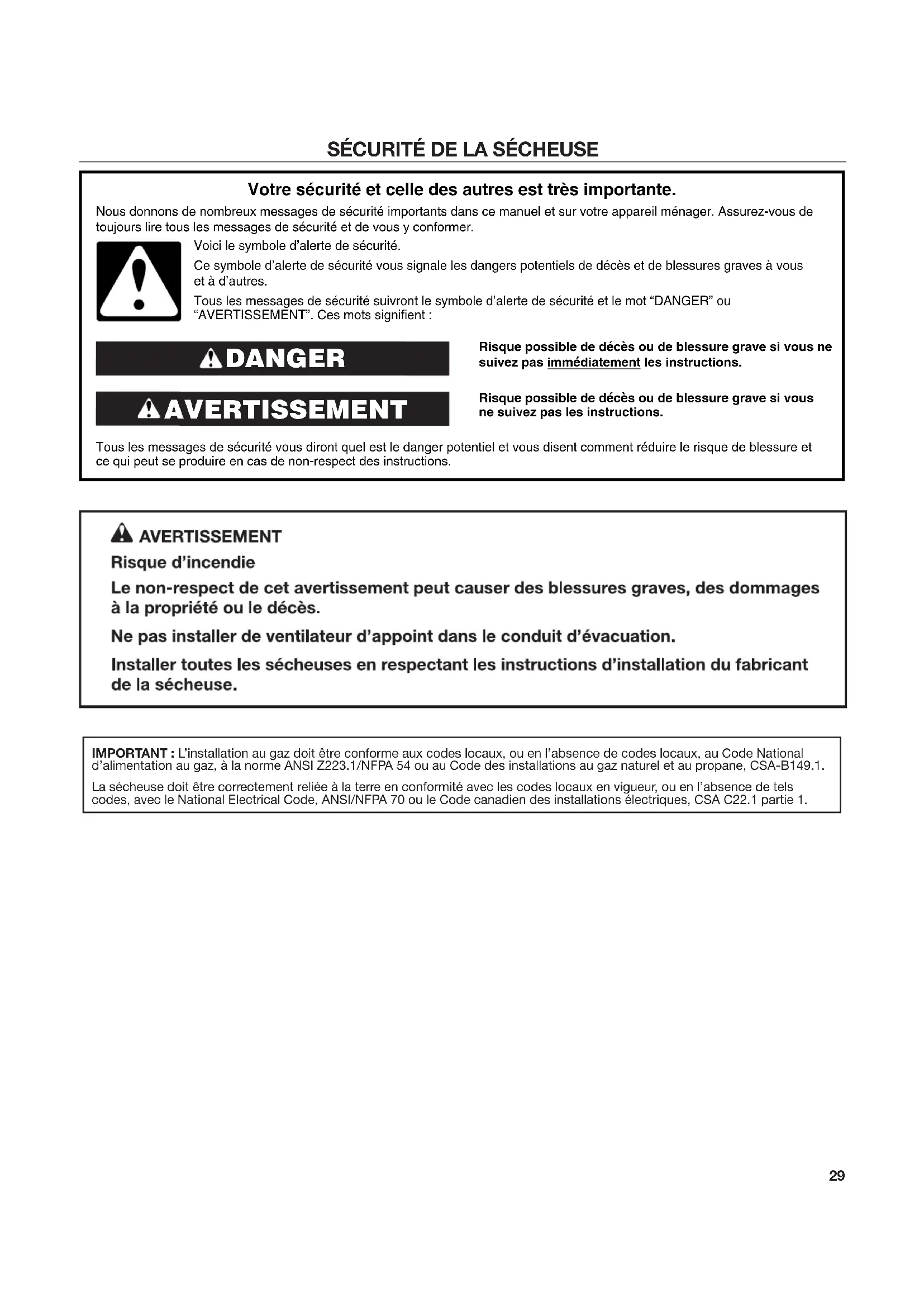 Risque possible de décès ou de blessure grave si vous ne suivez pas immédiatement les instructions. Risque possible de décès ou de blessure grave si vous ne suivez pas les instructions. Tous les messages de sécurité vous diront quel est le danger potentiel et vous disent comment réduire le risque de blessure et ce qui peut se produire en cas de non-respect des instructions. Votre sécurité et celle des autres est très importante. Nous donnons de nombreux messages de sécurité importants dans ce manuel et sur votre appareil ménager. Assurez-vous de toujours lire tous les messages de sécurité et de vous y conformer. AVERTISSEMENT DANGER Voici le symbole d’alerte de sécurité. Ce symbole d’alerte de sécurité vous signale les dangers potentiels de décès et de blessures graves à vous et à d’autres. Tous les messages de sécurité suivront le symbole d’alerte de sécurité et le mot “DANGER” ou “AVERTISSEMENT”. Ces mots signifient : IMPORTANT : L’installation au gaz doit être conforme aux codes locaux, ou en l’absence de codes locaux, au Code National d’alimentation au gaz, à la norme ANSI Z223.1/NFPA 54 ou au Code des installations au gaz naturel et au propane, CSA-B149.1. La sécheuse doit être correctement reliée à la terre en conformité avec les codes locaux en vigueur, ou en l’absence de tels codes, avec le National Electrical Code, ANSI/NFPA 70 ou le Code canadien des installations électriques, CSA C22.1 partie 1.30 Dans l’État du Massachusetts, les instructions d’installation suivantes sont applicables : Les travaux d’installation et réparation doivent être exécutés par un plombier ou tuyauteur qualifié ou licencié, ou par le personnel qualifié d’une entreprise licenciée par l’État du Massachusetts. Remplacer par des dispositifs de fermeture acceptables : Les robinets de gaz et robinets à bille installés pour l'utilisation devraient être indiqués. Si un conduit de raccordement flexible est utilisé, sa longueur ne doit pas dépasser 4 pi (121,9 cm).31
