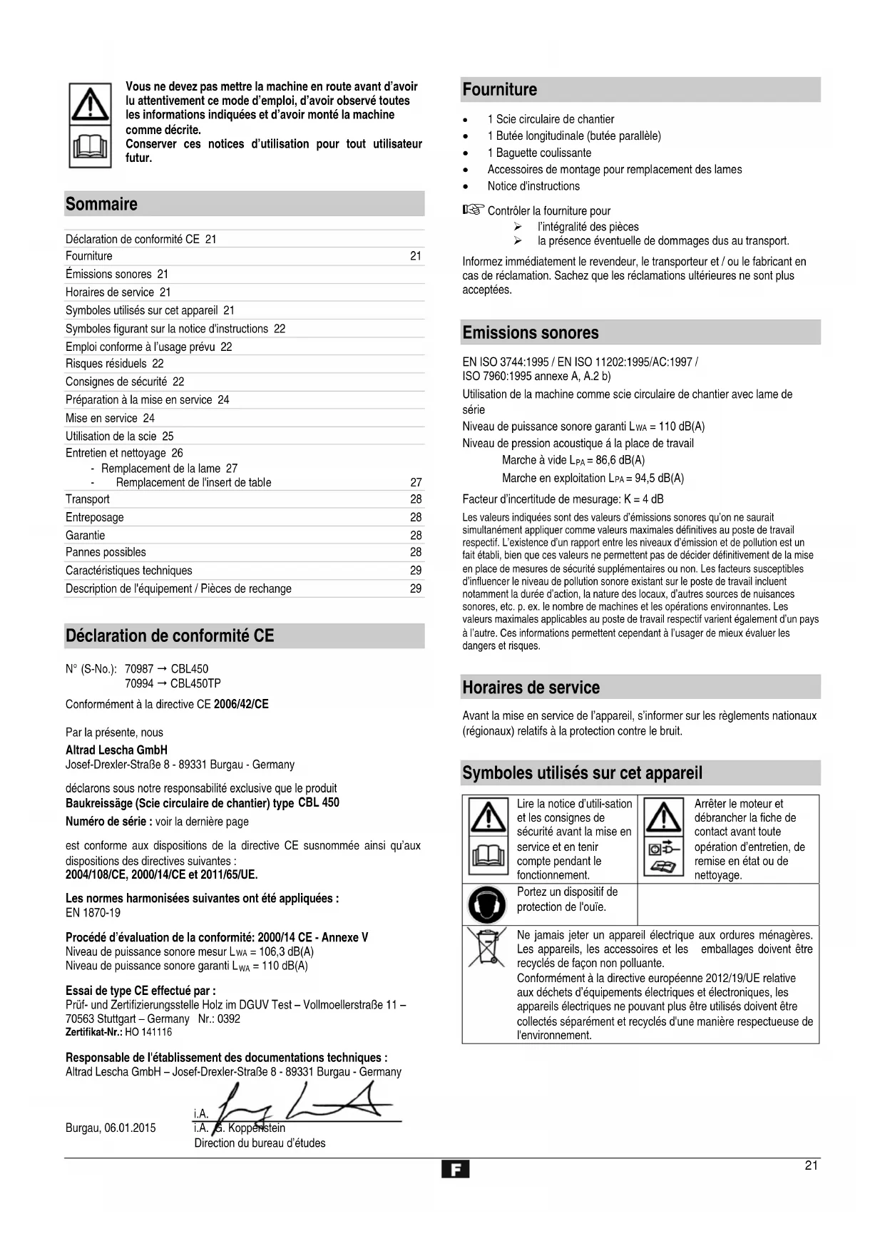 Téléchargez la notice de votre Scie au format PDF gratuitement ! Retrouvez votre notice CBL 450 - Lescha et reprennez votre appareil électronique en main. Sur cette page sont publiés tous les documents nécessaires à l'utilisation de votre appareil CBL 450 de la marque Lescha.