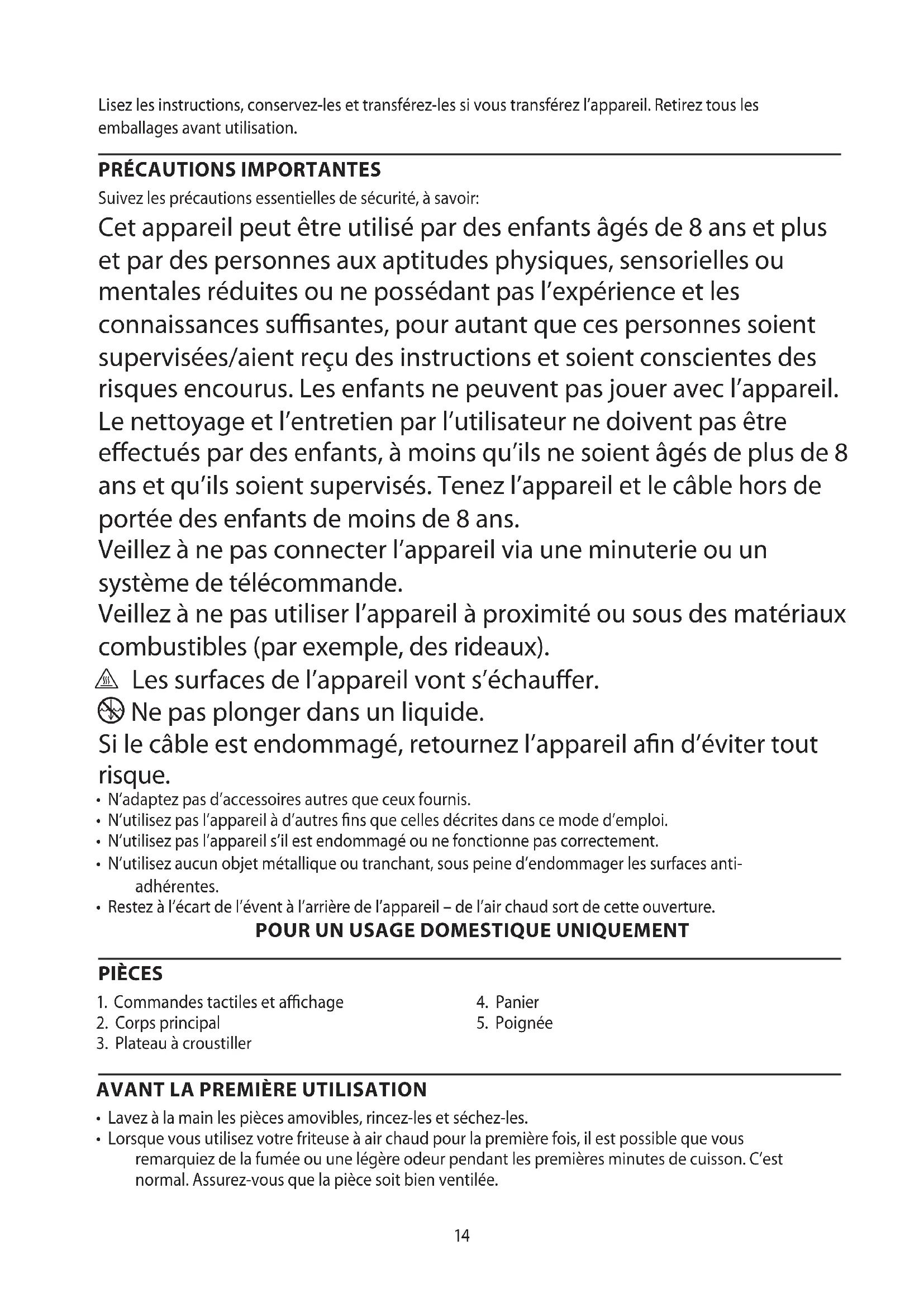 - Lorsque vous utilisez votre friteuse à air chaud pour la première fois, il est possible que vous remarquiez de la fumée ou une légère odeur pendant les premières minutes de cuisson. C’est normal. Assurez-vous que la pièce soit bien ventilée.15 PRÉPARATION