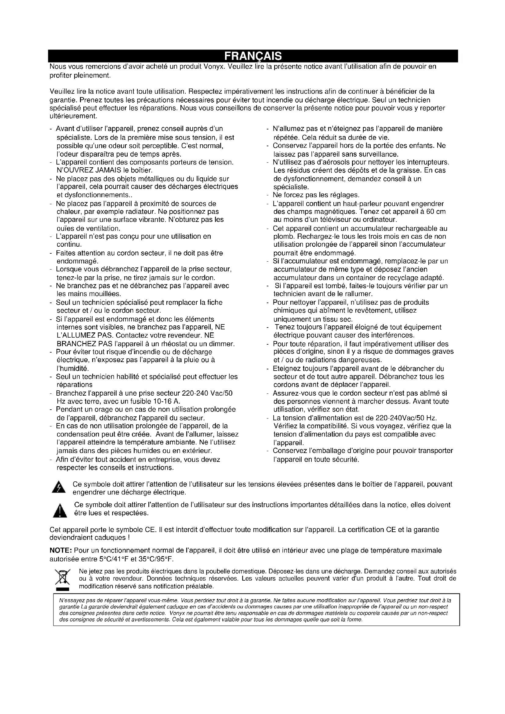 N’essayez pas de réparer l’appareil vous-même. Vous perdriez tout droit à la garantie. Ne faites aucune modification sur l’appareil. Vous perdriez tout droit à la garantie La garantie deviendrait également caduque en cas d’accidents ou dommages causes par une utilisation inappropriée de l’appareil ou un non-respect des consignes présentes dans cette notice. Vonyx ne pourrait être tenu responsable en cas de dommages matériels ou corporels causés par un non-respect des consignes de sécurité et avertissements. Cela est également valable pour tous les dommages quelle que soit la forme.16 DEBALLAGE ATTENTION ! Immédiatement après réception, vérifiez le contenu du carton et assurez-vous que tous les éléments sont bien présents et en bon état. Si besoin, faites les réserves nécessaires si le matériel ou les cartons sont endommagés. SI l’appareil doit être retourné, faites-le dans l’emballage d’origine. Si l’appareil a été exposé à des fluctuations importantes de températures (par exemple après le transport), ne l’allumez pas immédiatement. De la condensation peut survenir. Laissez l’appareil éteint le temps qu’il atteigne la température ambiante. ALIMENTATION Vous trouvez sur l’étiquette à l’arrière de l’appareil, le type d’alimentation à utiliser. Vérifiez que la tension d’alimentation corresponde à celle mentionnée. Toute autre alimentation peut endommager l’appareil. Reliez l’appareil au secteur, il est prêt à être utilisé. En aucun cas, vous ne devez utiliser de dimmer ou d’alimentation réglable. Connectez toujours l'appareil à un circuit protégé (disjoncteur ou fusible). Assurez-vous que l'appareil soit correctement relié à la terre afin d'éviter tout risque d'électrocution ou d'incendie