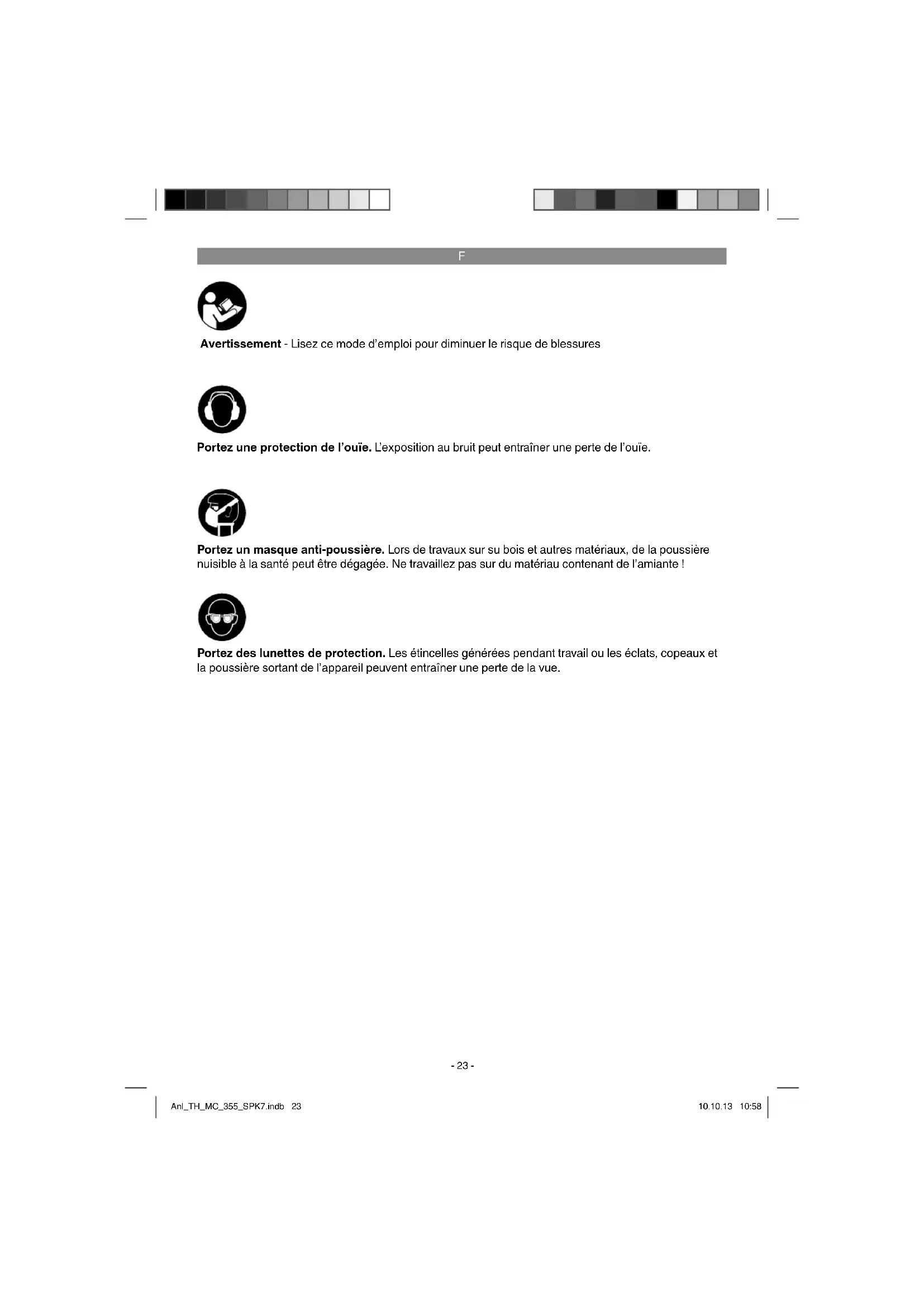 Avertissement - Lisez ce mode d’emploi pour diminuer le risque de blessures Portez une protection de l’ouïe. L’exposition au bruit peut entraîner une perte de l’ouïe. Portez des lunettes de protection. Les étincelles générées pendant travail ou les éclats, copeaux et la poussière sortant de l’appareil peuvent entraîner une perte de la vue. Portez un masque anti-poussière. Lors de travaux sur su bois et autres matériaux, de la poussière nuisible à la santé peut être dégagée. Ne travaillez pas sur du matériau contenant de l’amiante ! Anl_TH_MC_355_SPK7.indb 23Anl_TH_MC_355_SPK7.indb 23 10.10.13 10:5810.10.13 10:58F