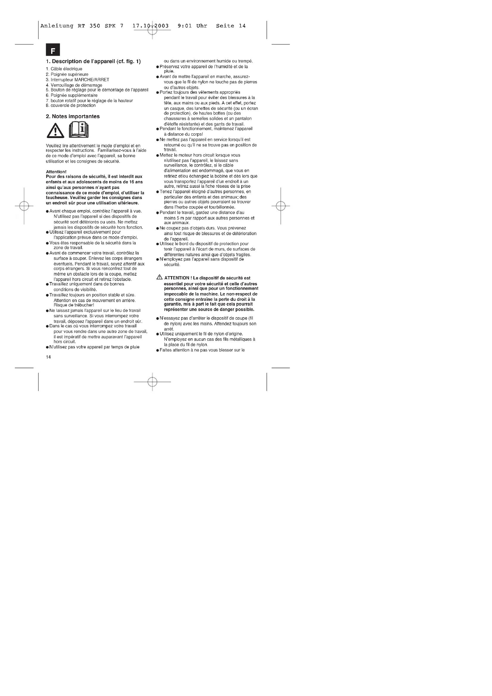 Anleitung RT 350 SPK 7 17.10.2003 9:01 Uhr Seite 1415 dispositif qui sert à découper la longueur de fil. Veillez à ce que les ouvertures d’air ne soient pas salies. Après l’emploi, retirez la fiche de la prise de courant et vérifiez que l’appareil ne présente pas de détériorations. Ne tentez pas de couper de l’herbe qui ne pousse pas sur le sol. Ne coupez pas d’herbe par exemple, poussant sur les murs ou sur les pierres etc. Dans la zone de travail de la faucheuse, l’utilisateur est responsable, vis-à-vis de tiers, des dommages causés par l’emploi de l’appareil. Ne traversez pas de routes ou de chemins caillouteux avec un appareil en marche. Lorsque vous n’utilisez pas l’appareil, gardez-le dans un endroit sec et inaccessible aux enfants. Utilisez l’appareil uniquement selon les descriptions du mode d’emploi et maintenez-le toujours verticalement par rapport au sol. Toute autre position est dangereuse. Vérifiez régulièrement si les vis sont bien serrées. La tension de secteur doit être identique à celle indiquée sur la plaque signalétique. Contrôlez régulièrement le câble de raccordement quant à des signes d’endommagement ou d’altération. N’utilisez l’appareil que si le câble de raccordement est en parfait état. Les câbles de raccordement utilisés ne doivent pas être plus légers que des conduites en tuyau flexible légères HO7RN-F conformément à la norme DIN 57282/VDE 0282 - ils doivent disposer d’un diamètre minimal de 1,5 mm