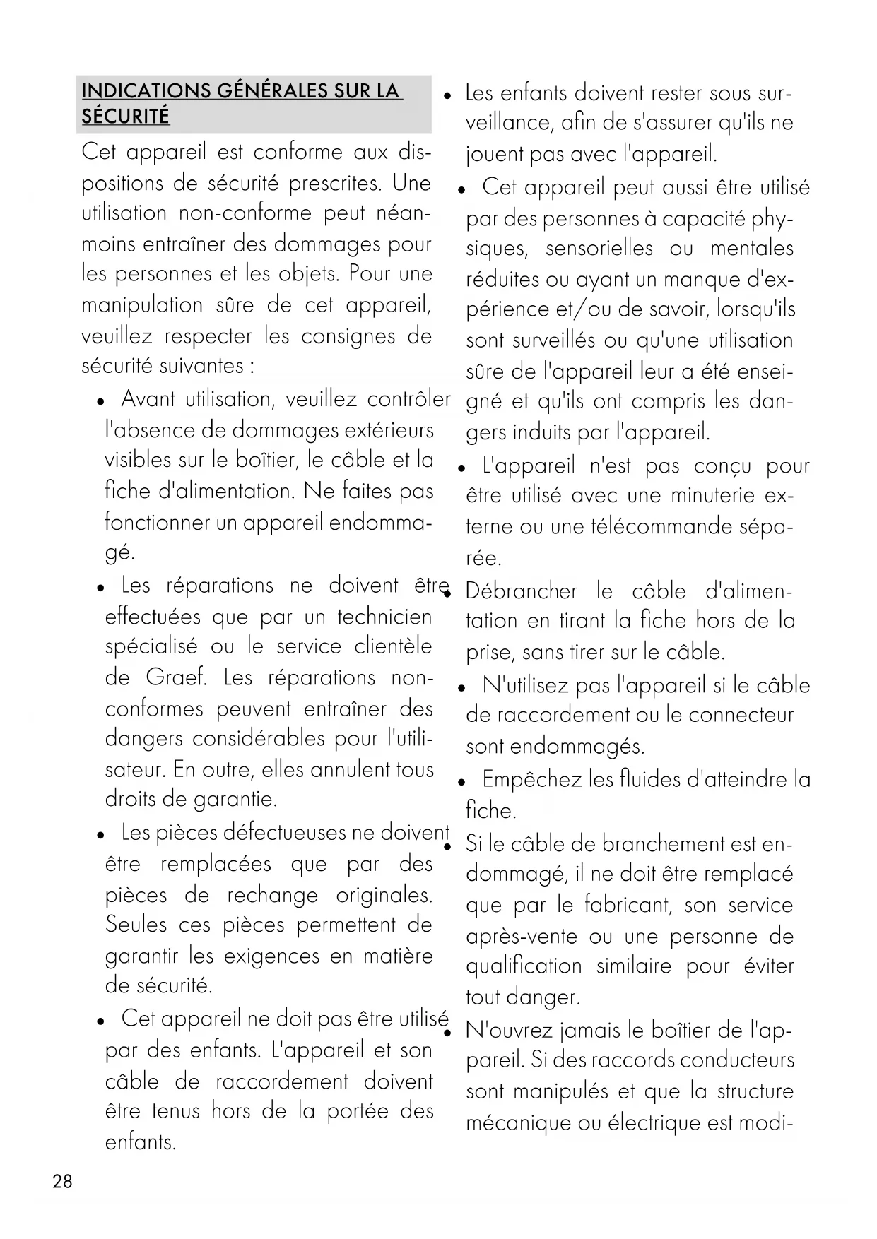 SÉCURITÉ Cet appareil est conforme aux dis- positions de sécurité prescrites. Une utilisation non-conforme peut néan- moins entraîner des dommages pour les personnes et les objets. Pour une manipulation sûre de cet appareil, veuillez respecter les consignes de sécurité suivantes: ● Avant utilisation, veuillez contrôler l'absence de dommages extérieurs visibles sur le boîtier, le câble et la fiche d'alimentation. Ne faites pas fonctionner un appareil endomma- gé. ● Les réparations ne doivent être effectuées que par un technicien spécialisé ou le service clientèle de Graef. Les réparations non- conformes peuvent entraîner des dangers considérables pour l'utili- sateur. En outre, elles annulent tous droits de garantie. ● Les pièces défectueuses ne doivent être remplacées que par des pièces de rechange originales. Seules ces pièces permettent de garantir les exigences en matière de sécurité. ● Cet appareil ne doit pas être utilisé par des enfants. L'appareil et son câble de raccordement doivent être tenus hors de la portée des enfants. ● Les enfants doivent rester sous sur- veillance, afin de s'assurer qu'ils ne jouent pas avec l'appareil. ● Cet appareil peut aussi être utilisé par des personnes à capacité phy- siques, sensorielles ou mentales réduites ou ayant un manque d'ex- périence et/ou de savoir, lorsqu'ils sont surveillés ou qu'une utilisation sûre de l'appareil leur a été ensei- gné et qu'ils ont compris les dan- gers induits par l'appareil. ● L'appareil n'est pas conçu pour être utilisé avec une minuterie ex- terne ou une télécommande sépa- rée. ● Débrancher le câble d'alimen- tation en tirant la fiche hors de la prise, sans tirer sur le câble. ● N'utilisez pas l'appareil si le câble de raccordement ou le connecteur sont endommagés. ● Empêchez les fluides d'atteindre la fiche. ● Si le câble de branchement est en- dommagé, il ne doit être remplacé que par le fabricant, son service après-vente ou une personne de qualification similaire pour éviter tout danger. ● N'ouvrez jamais le boîtier de l'ap- pareil. Si des raccords conducteurs sont manipulés et que la structure mécanique ou électrique est modi-29
