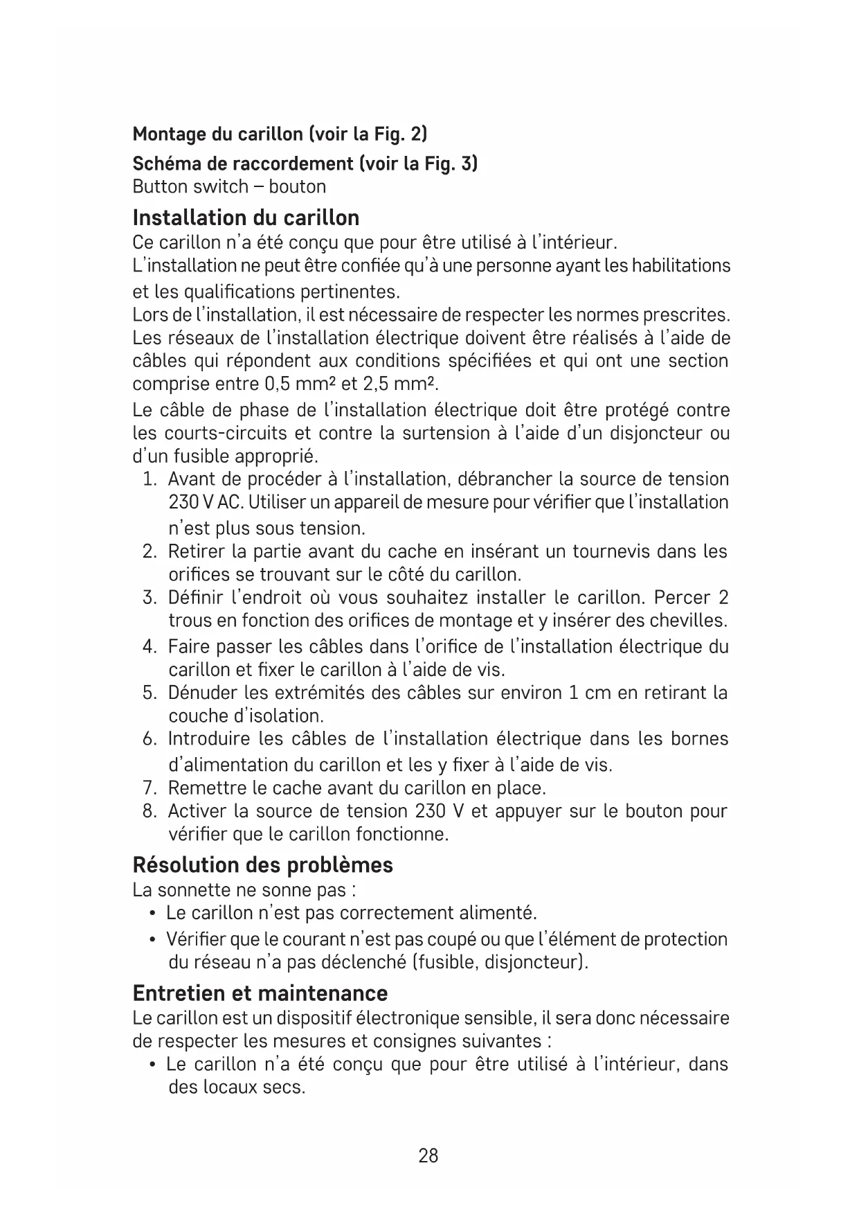 FR | Carillon laire Ce carillon a été conçu pour être raccordé en permanence à un réseau électrique ayant une tension de 230 V AC/50 Hz. An de pouvoir utiliser correctement ce carillon, il est important que vous lisiez attentivement la présente notice. Spécications techniques Protection : IP20 Nombre de mélodies : 1 Alimentation du carillon : 230 V AC/50 Hz Description du carillon (voir la Fig. 1) 1a – orice de montage/suspen- sion à un mur 1b – orice de montage 2 – orice destiné à l’installation électrique 3 – orice permettant d’ouvrir le cache 4 – cache avant28 Montage du carillon (voir la Fig. 2) Schéma de raccordement (voir la Fig. 3) Button switch – bouton Installation du carillon Ce carillon n’a été conçu que pour être utilisé à l’intérieur. L’installation ne peut être conée qu’à une personne ayant les habilitations et les qualications pertinentes. Lors de l’installation, il est nécessaire de respecter les normes prescrites. Les réseaux de l’installation électrique doivent être réalisés à l’aide de câbles qui répondent aux conditions spéciées et qui ont une section comprise entre 0,5 mm et 2,5 mm. Le câble de phase de l’installation électrique doit être protégé contre les courts-circuits et contre la surtension à l’aide d’un disjoncteur ou d’un fusible approprié.