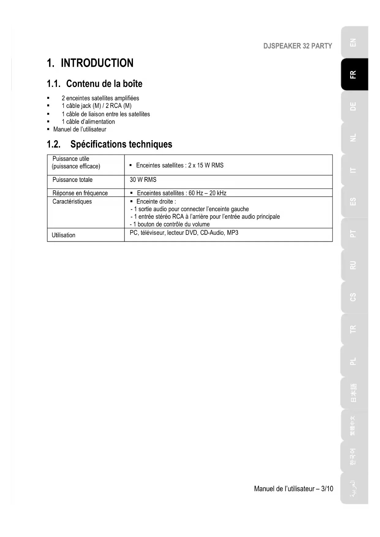1.1. Contenu de la boîte 2 enceintes satellites amplifiées 1 câble jack (M) / 2 RCA (M) 1 câble de liaison entre les satellites 1 câble d’alimentation Manuel de l’utilisateur 1.2. Spécifications techniques Puissance utile (puissance efficace) Enceintes satellites : 2 x 15 W RMS Puissance totale 30 W RMS Réponse en fréquence Enceintes satellites : 60 Hz – 20 kHz Caractéristiques Enceinte droite : - 1 sortie audio pour connecter l’enceinte gauche - 1 entrée stéréo RCA à l’arrière pour l’entrée audio principale - 1 bouton de contrôle du volume Utilisation PC, téléviseur, lecteur DVD, CD-Audio, MP3DJSPEAKER 32 PARTY 4/10 – Manuel de l’utilisateur 1.3. Recommandations - Placez vos enceintes satellites sur une surface plane pour éviter tout risque de chute. - N’ouvrez en aucun cas votre kit d’enceintes, vous risqueriez d’endommager les composants internes. - Ce kit d’enceintes est destiné à une utilisation sous climat tempéré. - Pour prévenir tout risque d’incendie ou de décharge électrique, tenez votre kit d’enceintes éloigné : - de la pluie ou de l’humidité, de tout fluide (eau, produits chimiques ou tout autre liquide), - de sources de chaleur telles que radiateurs, cuisinières ou tout autre appareil émetteur de chaleur (y compris les amplificateurs), - des rayons directs du soleil. - Evitez d’exposer le kit d’enceintes à des égouttements d’eau ou à des éclaboussures. - Ne placez aucun objet rempli de liquide (verre, vase…) sur le kit d’enceintes. - Débranchez le cordon d’alimentation si vous prévoyez de ne pas utiliser le kit d’enceintes pendant une période prolongée. Pour débrancher le cordon d’alimentation, tirez sur la fiche. Ne tirez jamais sur le cordon proprement dit. - Veillez à ce que la prise d’alimentation du kit d’enceintes branchée sur le secteur reste facilement accessible. - Débranchez le kit d’enceintes avant tout nettoyage. Utilisez un chiffon humide et évitez l’usage d’aérosols. - La prise d’alimentation du kit sert de dispositif de mise hors tension et doit donc à tout moment être facilement accessible. - Les marquages se situent au dos des enceintes.