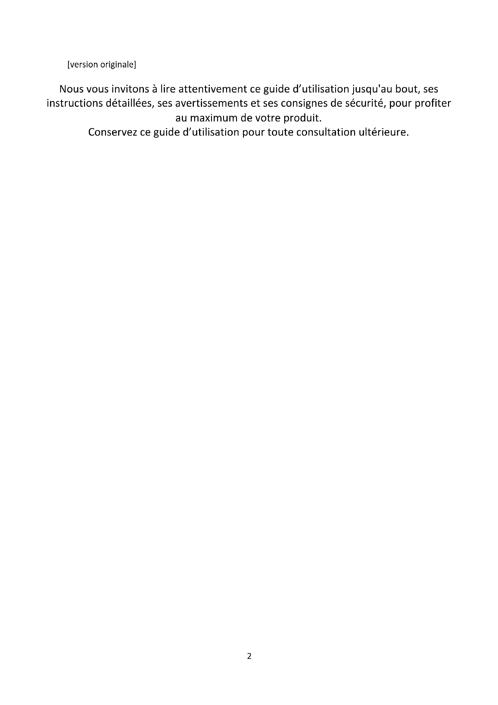 Guide d’utilisation2 FR [version originale] Nous vous invitons à lire attentivement ce guide d’utilisation jusqu'au bout, ses instructions détaillées, ses avertissements et ses consignes de sécurité, pour profiter au maximum de votre produit. Conservez ce guide d’utilisation pour toute consultation ultérieure.3