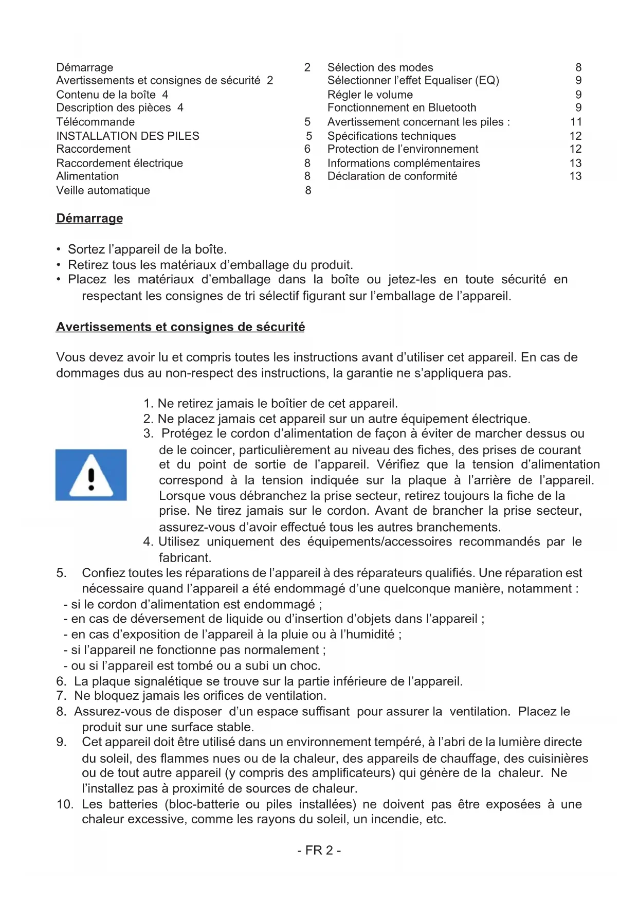 Raccordement 6 Raccordement électrique 8 Alimentation 8 Veille automatique 8 Sélection des modes 8 Sélectionner l’eet Equaliser (EQ) 9 Régler le volume 9 Fonctionnement en Bluetooth 9 Avertissement concernant les piles : 11 Spécications techniques 12 Protection de l’environnement 12 Informations complémentaires 13 Déclaration de conformité 13- FR 3 -