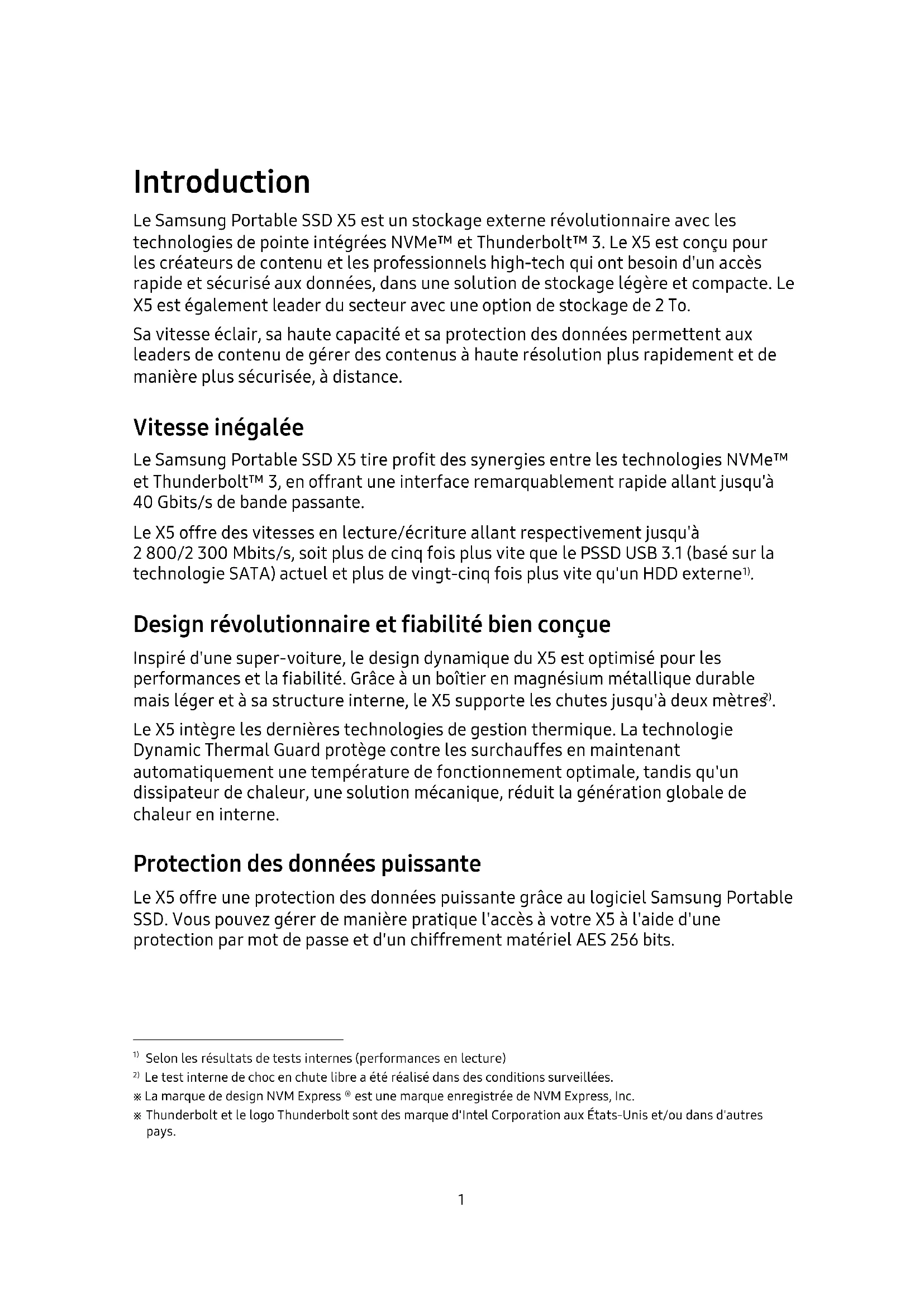 - Certifications Introduction Le Samsung Portable SSD X5 est un stockage externe révolutionnaire avec les technologies de pointe intégrées NVMe™ et Thunderbolt™ 3. Le X5 est conçu pour les créateurs de contenu et les professionnels high-tech qui ont besoin d'un accès rapide et sécurisé aux données, dans une solution de stockage légère et compacte. Le X5 est également leader du secteur avec une option de stockage de 2 To. Sa vitesse éclair, sa haute capacité et sa protection des données permettent aux leaders de contenu de gérer des contenus à haute résolution plus rapidement et de manière plus sécurisée, à distance. Vitesse inégalée Le Samsung Portable SSD X5 tire profit des synergies entre les technologies NVMe™ et Thunderbolt™ 3, en offrant une interface remarquablement rapide allant jusqu'à 40 Gbits/s de bande passante. Le X5 offre des vitesses en lecture/écriture allant respectivement jusqu'à 2 800/2 300 Mbits/s, soit plus de cinq fois plus vite que le PSSD USB 3.1 (basé sur la technologie SATA) actuel et plus de vingt-cinq fois plus vite qu'un HDD externe p. 201
