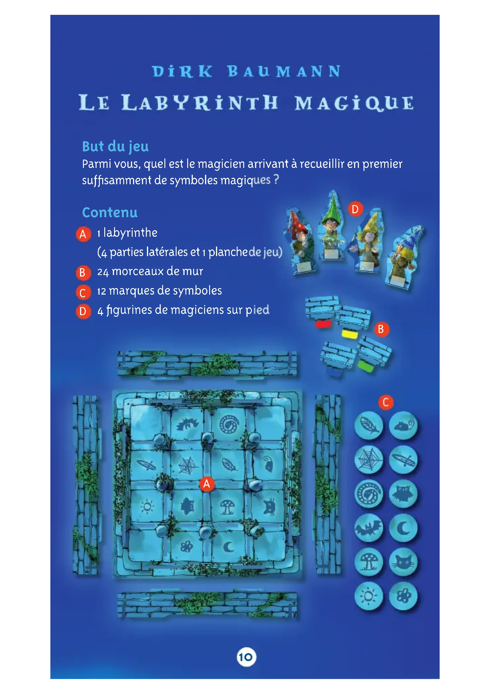 A Assemblez tout d'abord les 4 parties latérales et B placez la planche de jeu par-dessus. C Insérez ensuite tous les morceaux de murs, avec la partie en couleur vers le bas, dans les fentes de la planche de jeu. Tournez ensuite plusieurs fois le labyrinthe en prononçant à haute voix la phrase suivante : « Que le labyrinthe se découvre ! Que les murs s'entrouvrent ! Que les voies s'ouvrent ! » Chacun choisis une figurine de magicien et la place sur l'une des cases d'angle (ou sur des angles opposés, dans le cas de deux joueurs). Les marques de symboles sont bien mélangées et placées à côté de la planche de jeu, le verso étant dirigé vers le haut. Retournez ensuite une marque de symbole et placez-la sur le symbole correspondant de la planche de jeu. Elle constitue votre première cible.