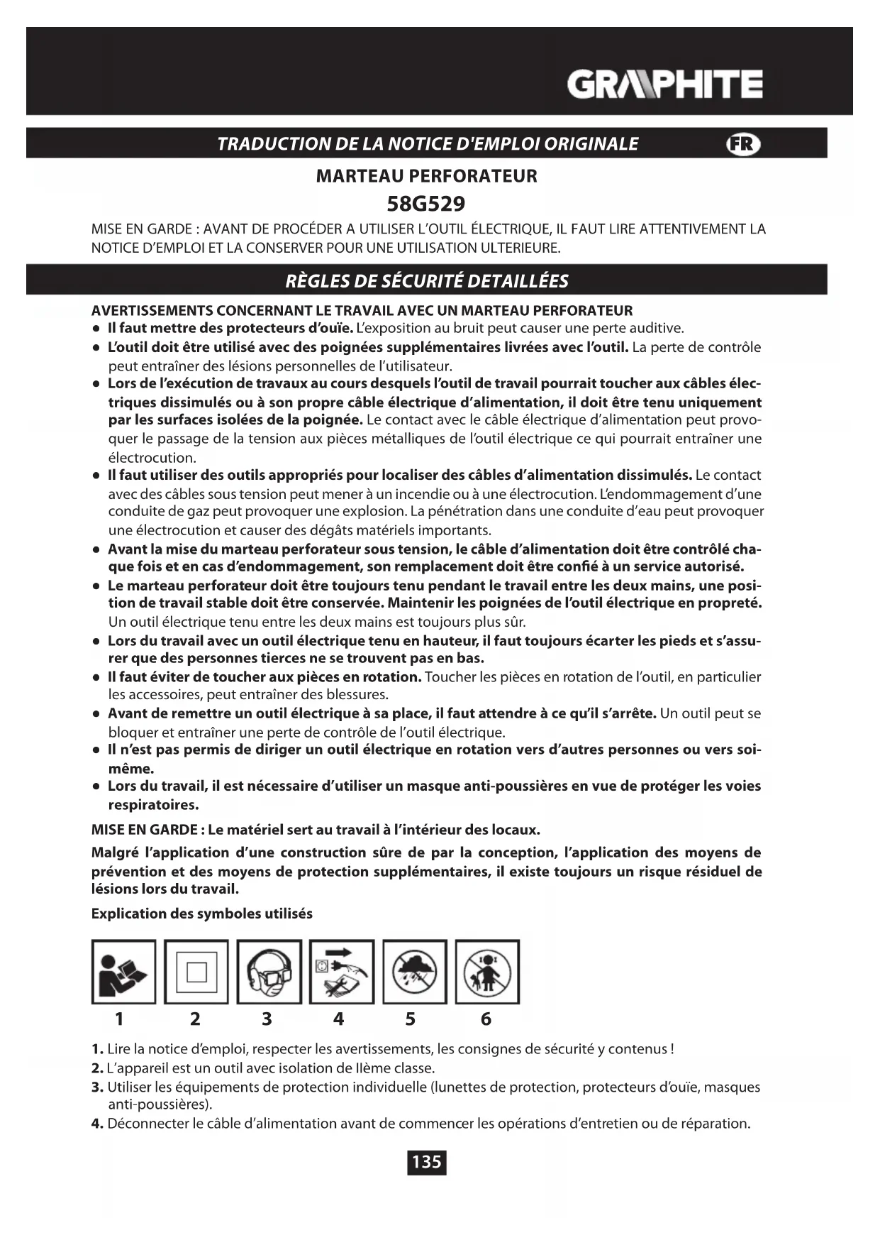 MARTEAU PERFORATEUR 58G529 MISE EN GARDE : AVANT DE PROCÉDER A UTILISER L’OUTIL ÉLECTRIQUE, IL FAUT LIRE ATTENTIVEMENT LA NOTICE D’EMPLOI ET LA CONSERVER POUR UNE UTILISATION ULTERIEURE. RÈGLES DE SÉCURITÉ DETAILLÉES AVERTISSEMENTS CONCERNANT LE TRAVAIL AVEC UN MARTEAU PERFORATEUR ● Il faut mettre des protecteurs d’ouïe. L’exposition au bruit peut causer une perte auditive. ● L’outil doit être utilisé avec des poignées supplémentaires livrées avec l’outil. La perte de contrôle peut entraîner des lésions personnelles de l’utilisateur. ● Lors de l’exécution de travaux au cours desquels l’outil de travail pourrait toucher aux câbles élec- triques dissimulés ou à son propre câble électrique d’alimentation, il doit être tenu uniquement par les surfaces isolées de la poignée. Le contact avec le câble électrique d’alimentation peut provo- quer le passage de la tension aux pièces métalliques de l’outil électrique ce qui pourrait entraîner une électrocution. ● Il faut utiliser des outils appropriés pour localiser des câbles d’alimentation dissimulés. Le contact avec des câbles sous tension peut mener à un incendie ou à une électrocution. L’endommagement d’une conduite de gaz peut provoquer une explosion. La pénétration dans une conduite d’eau peut provoquer une électrocution et causer des dégâts matériels importants. ● Avant la mise du marteau perforateur sous tension, le câble d’alimentation doit être contrôlé cha- que fois et en cas d’endommagement, son remplacement doit être coné à un service autorisé. ● Le marteau perforateur doit être toujours tenu pendant le travail entre les deux mains, une posi- tion de travail stable doit être conservée. Maintenir les poignées de l’outil électrique en propreté. Un outil électrique tenu entre les deux mains est toujours plus sûr. ● Lors du travail avec un outil électrique tenu en hauteur, il faut toujours écarter les pieds et s’assu- rer que des personnes tierces ne se trouvent pas en bas. ● Il faut éviter de toucher aux pièces en rotation. Toucher les pièces en rotation de l’outil, en particulier les accessoires, peut entraîner des blessures. ● Avant de remettre un outil électrique à sa place, il faut attendre à ce qu’il s’arrête. Un outil peut se bloquer et entraîner une perte de contrôle de l’outil électrique. ● Il n’est pas permis de diriger un outil électrique en rotation vers d’autres personnes ou vers soi- même. ● Lors du travail, il est nécessaire d’utiliser un masque anti-poussières en vue de protéger les voies respiratoires. MISE EN GARDE : Le matériel sert au travail à l’intérieur des locaux. Malgré l’application d’une construction sûre de par la conception, l’application des moyens de prévention et des moyens de protection supplémentaires, il existe toujours un risque résiduel de lésions lors du travail. Explication des symboles utilisés