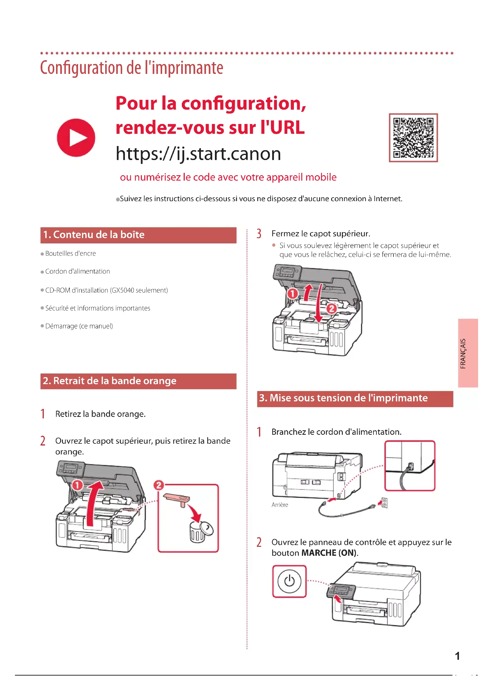 Bouteilles d'encre Cordon d'alimentation CD-ROM d'installation (GX5040 seulement) Sécurité et informations importantes Démarrage (ce manuel)
