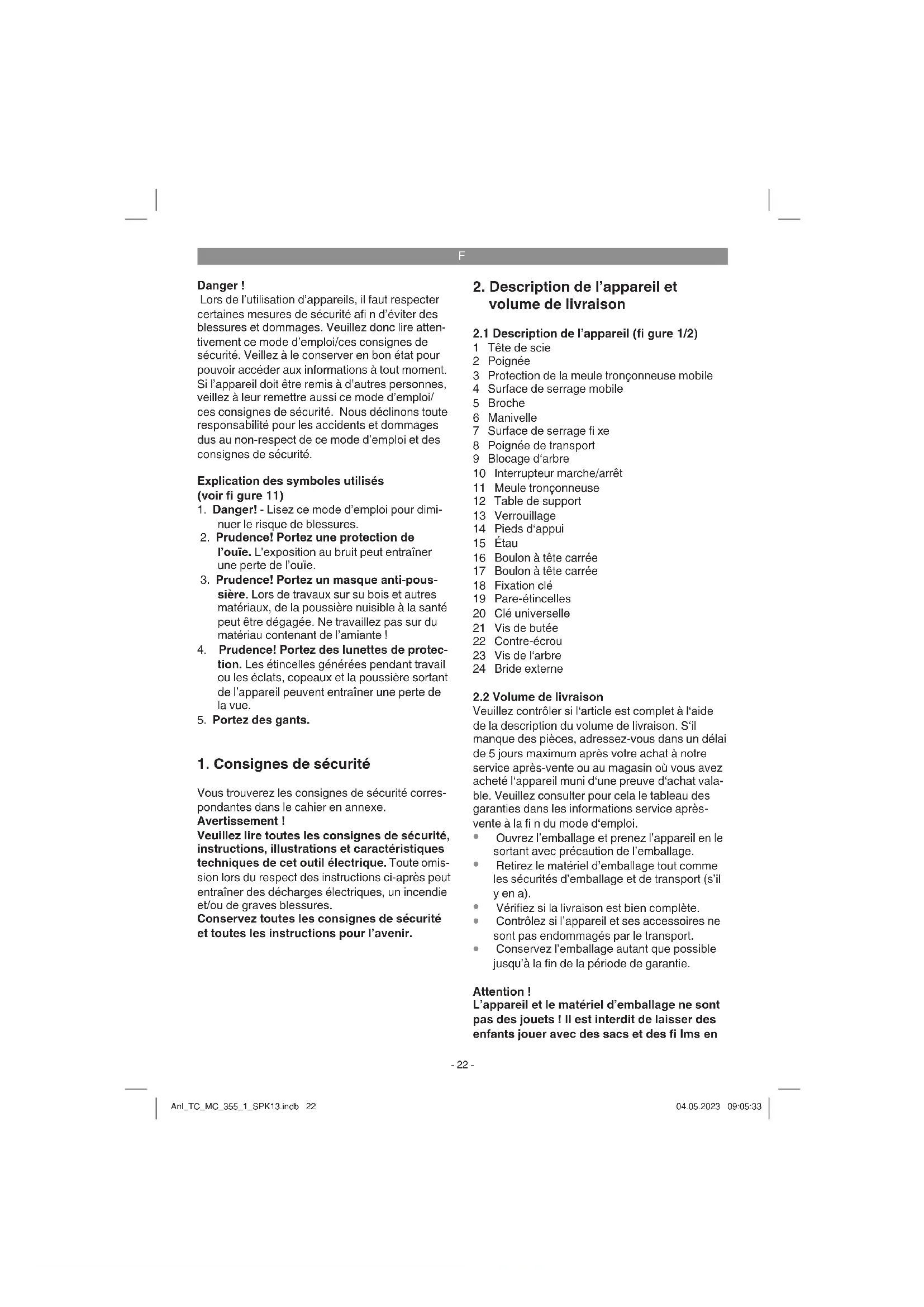 Pendant la coupe, il faut appuyer fortement et régulièrement sur la poignée (2) vers le bas. Anl_TC_MC_355_1_SPK13.indb 25Anl_TC_MC_355_1_SPK13.indb 25 04.05.2023 09:05:3404.05.2023 09:05:34F