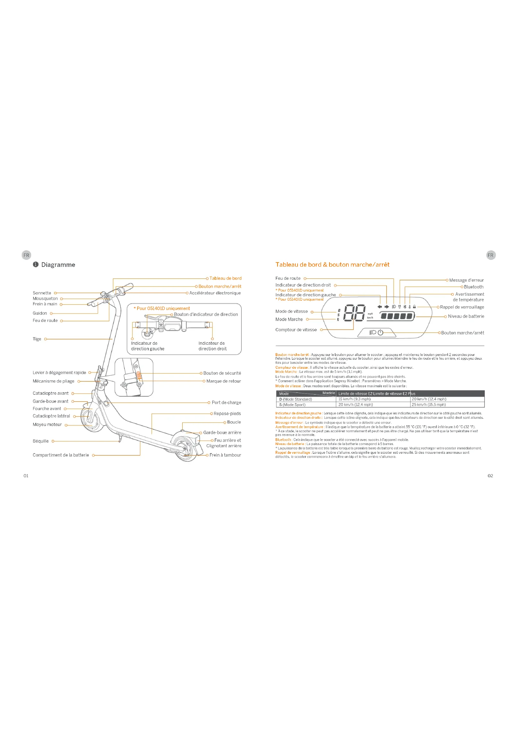 - Pour 051401D uniquement Feu de route Message d'erreur Niveau de batterie Bouton marche/arrêt Modèle Mode Limite de vitesse E2 Limite de vitesse E2 Plus 15km/h (9,3mph) 20km/h (12,4mph) 20km/h (12,4mph) 25km/h (15,5mph) D (Mode Standard) S (Mode Sport) Sonnette Guidon Accélérateur électronique Bouton d'indicateur de direction Indicateur de direction gauche Indicateur de direction droit Mousqueton Tableau de bord Frein à main Feu de route Tige Bouton de sécurité Marque de retour Mécanisme de pliage Levier à dégagement rapide Fourche avant Garde-boue avant Moyeu moteur Port de charge Repose-pieds Boucle Garde-boue arrière Frein à tambour Catadioptre latéral Catadioptre avant Béquille Compartiment de la batterie Bouton marche/arrêt Indicateur de direction gauche Indicateur de direction droit Feu arrière et Clignotant arrière