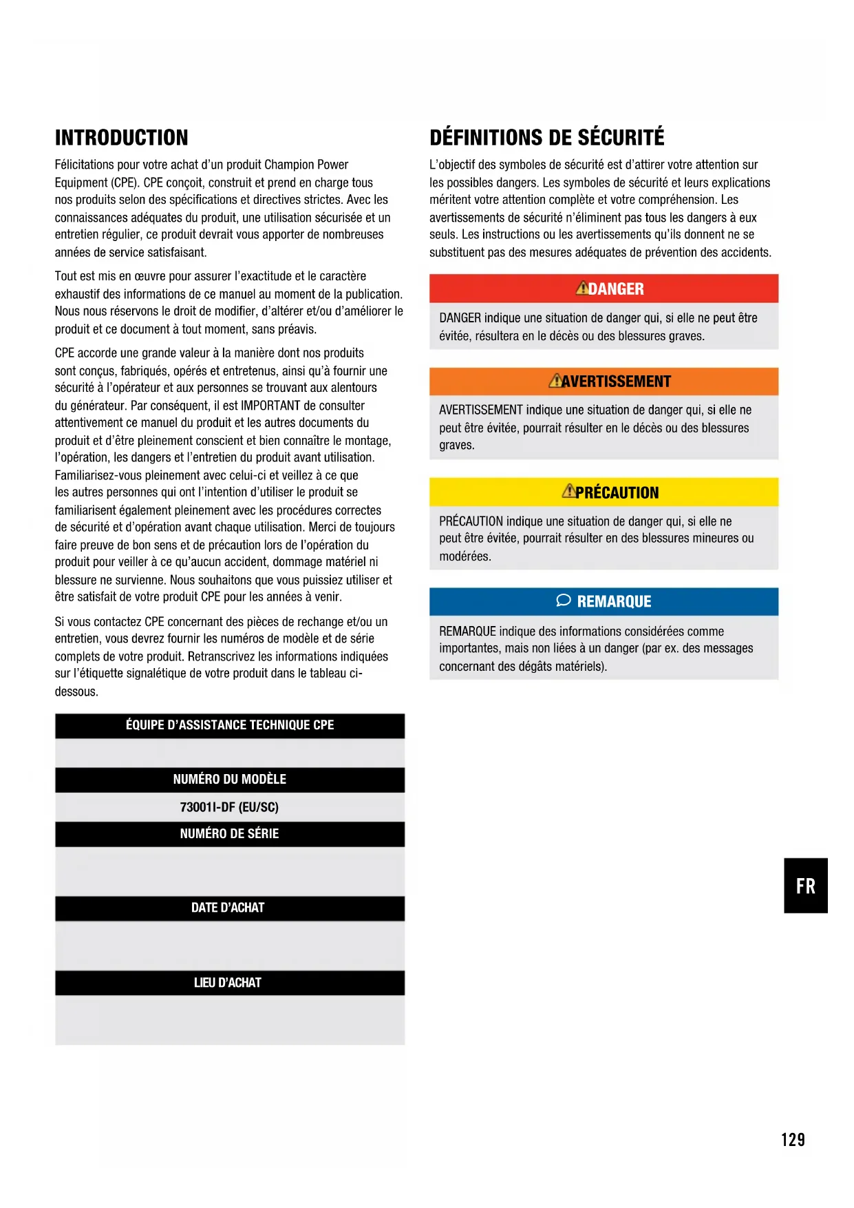 Félicitations pour votre achat d'un produit Champion Power Equipment (CPE). CPE conçoit, construit et prend en charge tous nos produits selon des spécifications et directives strictes. Avec les connaissances adéquates du produit, une utilisation sécurisée et un entretien régulier, ce produit devrait vous apporter de nombreuses années de service satisfaisant.