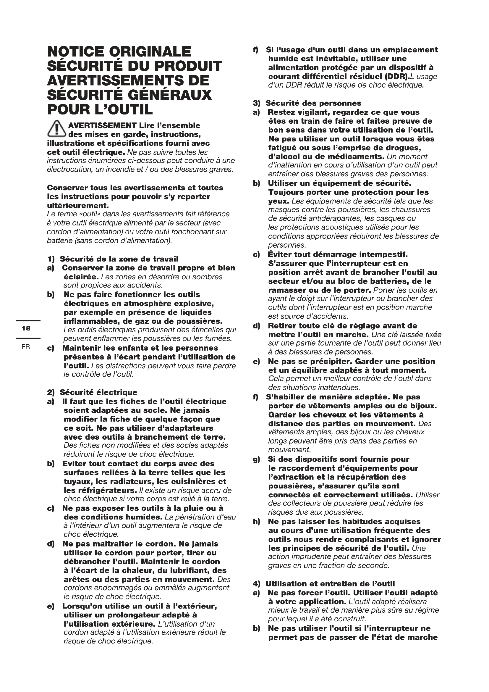 Ne pas faire fonctionner les outils électriques en atmosphère explosive, par exemple en présence de liquides inflammables, de gaz ou de poussières. Les outils électriques produisent des étincelles qui peuvent enflammer les poussières ou les fumées. c) Maintenir les enfants et les personnes présentes à l’écart pendant l’utilisation de l’outil. Les distractions peuvent vous faire perdre le contrôle de l’outil.