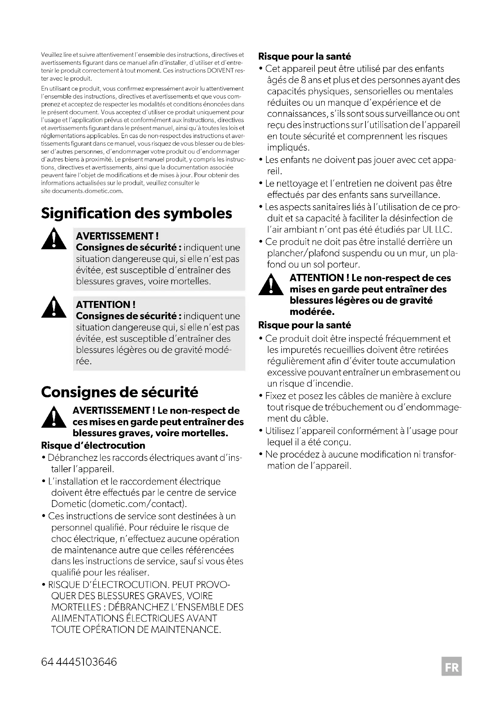 Veuillez lire et suivre attentivement l’ensemble des instructions, directives et avertissements figurant dans ce manuel afin d’installer, d’utiliser et d’entre-tenir le produit correctement à tout moment. Ces instructions DOIVENT res-ter avec le produit.En utilisant ce produit, vous confirmez expressément avoir lu attentivement l’ensemble des instructions, directives et avertissements et que vous com-prenez et acceptez de respecter les modalités et conditions énoncées dans le présent document. Vous acceptez d’utiliser ce produit uniquement pour l’usage et l’application prévus et conformément aux instructions, directives et avertissements figurant dans le présent manuel, ainsi qu’à toutes les lois et réglementations applicables. En cas de non-respect des instructions et aver-tissements figurant dans ce manuel, vous risquez de vous blesser ou de bles- ser d’autres personnes, d’endommager votre produit ou d’endommager d’autres biens à proximité. Le présent manuel produit, y compris les instruc-tions, directives et avertissements, ainsi que la documentation associée peuvent faire l’objet de modifications et de mises à jour. Pour obtenir des informations actualisées sur le produit, veuillez consulter le site documents.dometic.com. Signification des symboles