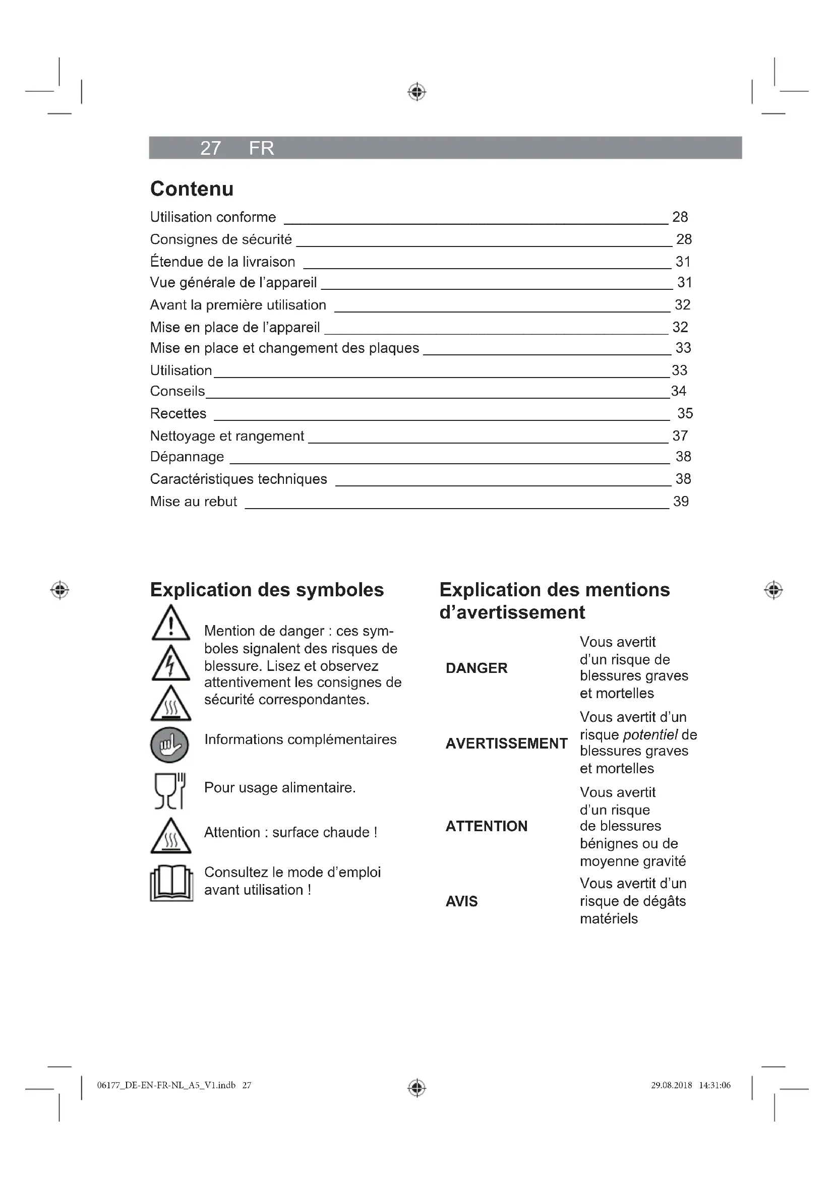 Mention de danger : ces symboles signalent des risques de blessure. Lisez et observez attentivement les consignes de sécurité correspondantes.