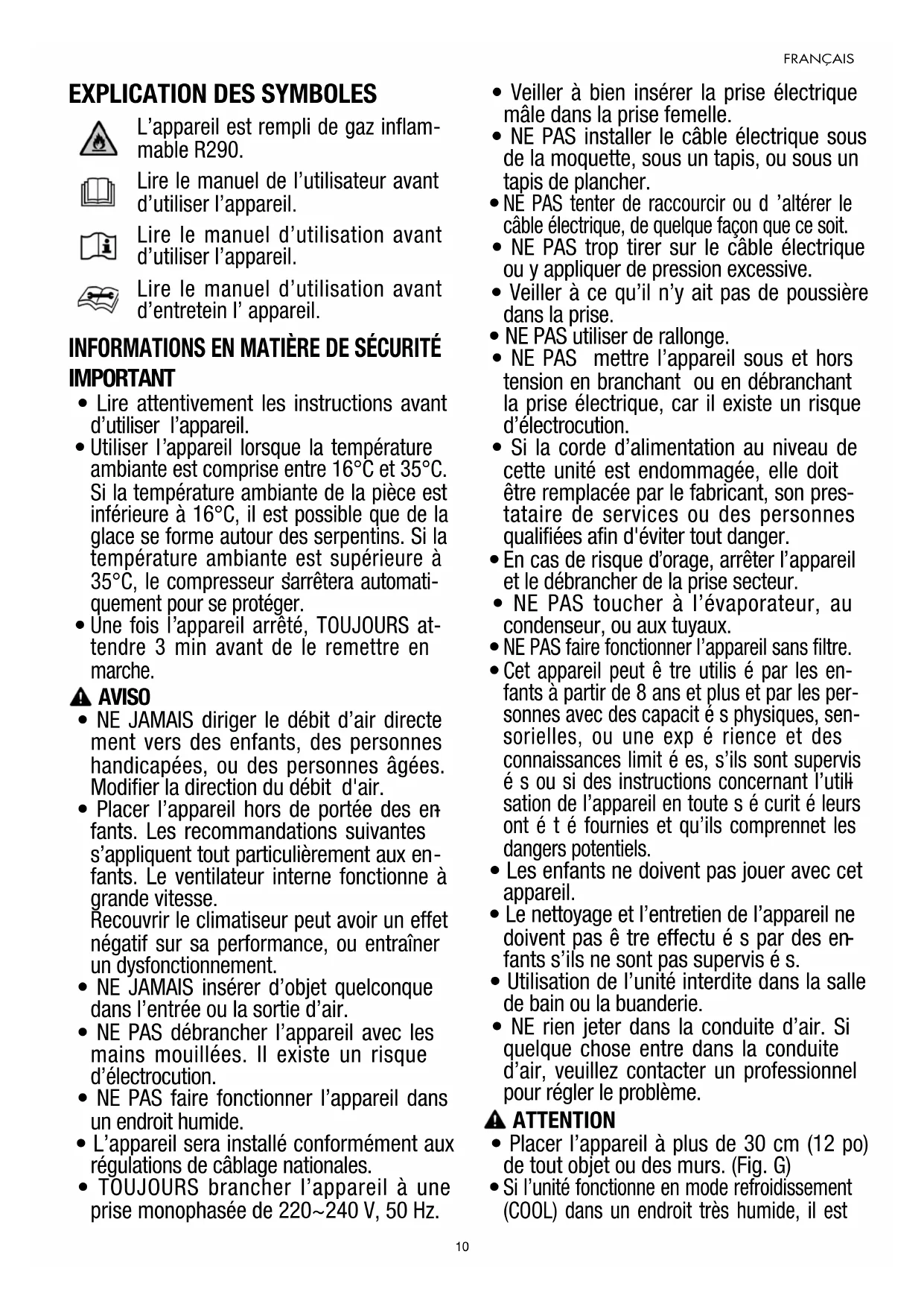 L’appareil est rempli de gaz inflam- mable R290. Lire le manuel de l’utilisateur avant d’utiliser l’appareil. Lire le manuel d’utilisation avant d’utiliser l’appareil. Lire le manuel d’utilisation avant d’entretein l’ appareil. INFORMATIONS EN MATIÈRE DE SÉCURITÉ IMPORTANT
