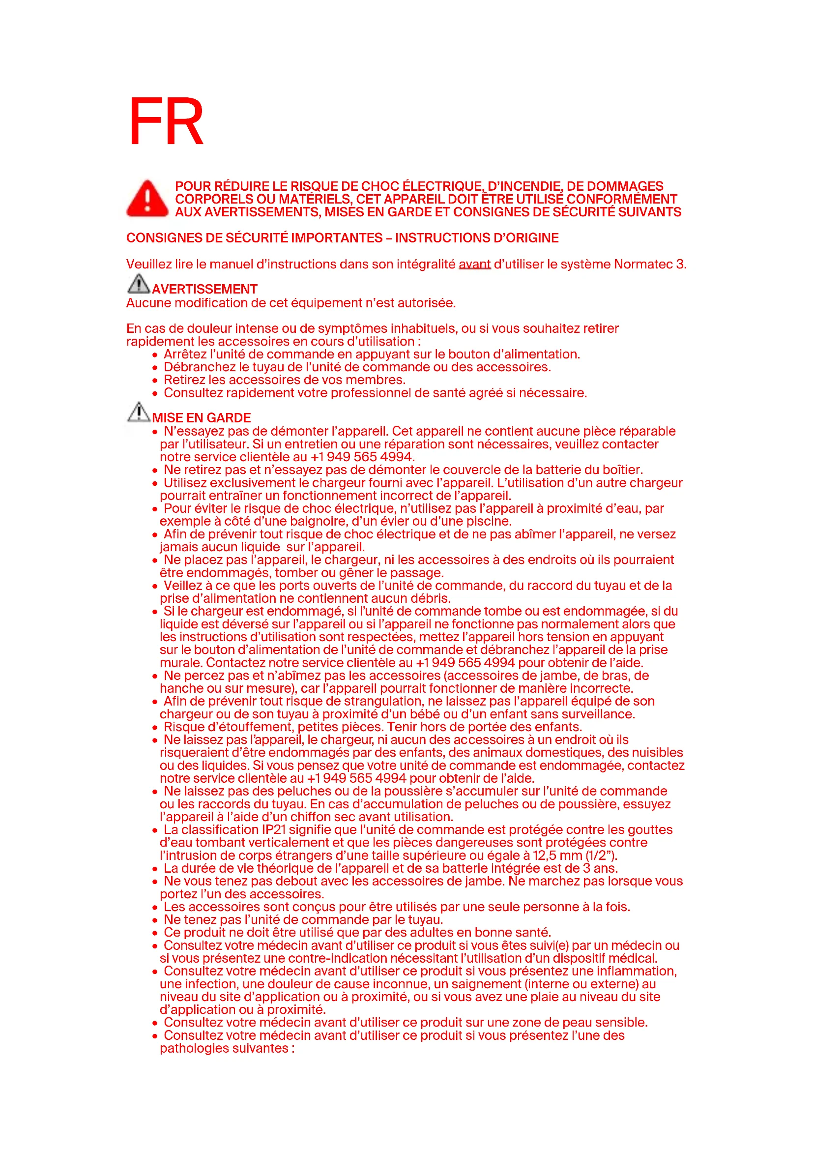 Le Normatec 3 est un appareil de massage à air comprimé conçu pour soulager temporairement les courbatures et/ou douleurs musculaires mineures et pour augmenter temporairement la circulation vers la zone traitée. RISQUES ET AVANTAGES DU SYSTÈME NORMATEC3 Les risques et les avantages de l’utilisation du système Normatec3 sont similaires à ceux d’un massage. Si le massage à l’aide du système Normatec3 est désagréable, vous pouvez réduire l’intensité ou arrêter la séance. Les avantages incluent un soulagement temporaire des courbatures et des douleurs musculaires, et une augmentation de la circulation dans la zone massée. Contactez notre service clientèle au +19495654994 si vous avez des questions.ILLUSTRATIONS Unité de commande Normatec3 (utilisable sur une seule personne) Tuyau Normatec3 Accessoire de jambe Normatec3 (utilisable sur une seule personne)