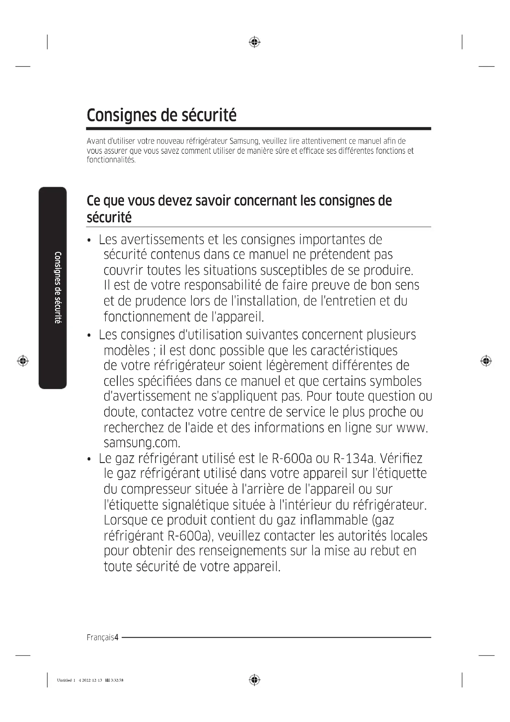 - Le gaz réfrigérant utilisé est le R-600a ou R-134a. Vériez le gaz réfrigérant utilisé dans votre appareil sur l'étiquette du compresseur située à l'arrière de l'appareil ou sur l'étiquette signalétique située à l'intérieur du réfrigérateur. Lorsque ce produit contient du gaz inammable (gaz réfrigérant R-600a), veuillez contacter les autorités locales pour obtenir des renseignements sur la mise au rebut en toute sécurité de votre appareil. Consignes de sécurité Untitled-1 4 2022-12-13 3:32:58Français 5 Consignes de sécurité