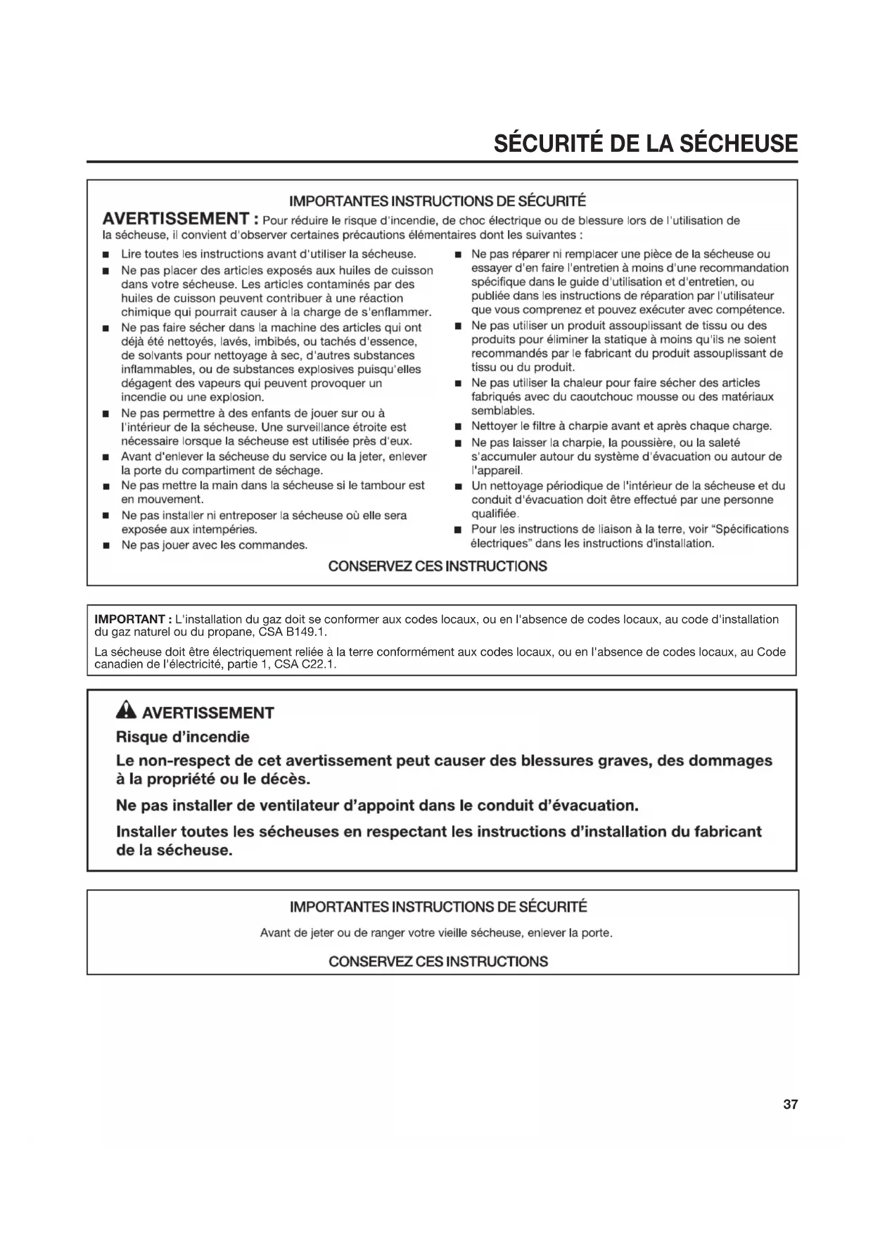 IMPORTANT : L'installation du gaz doit se conformer aux codes locaux, ou en l'absence de codes locaux, au code d'installation du gaz naturel ou du propane, CSA B149.1. La sécheuse doit être électriquement reliée à la terre conformément aux codes locaux, ou en l'absence de codes locaux, au Code canadien de l'électricité, partie 1, CSA C22.1.